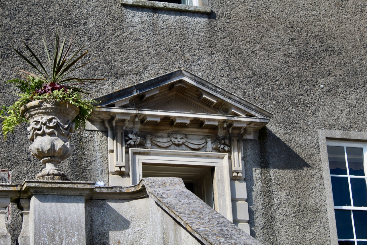 The large central urn located on the roof parapet is on a plinth carved with swags, and there are smaller urns dotted around the roof.