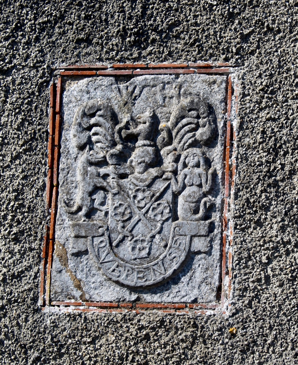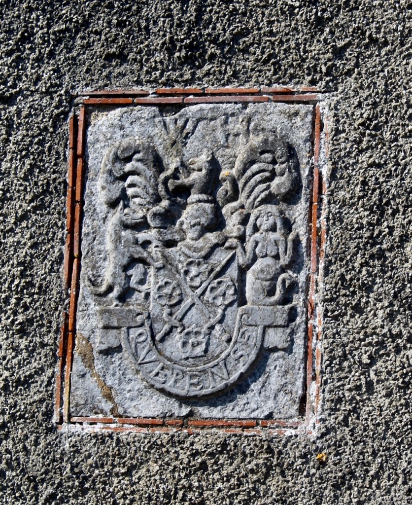 The family coat of arms depicts a mermaid and a sea lion. The mermaid is often pictured holding a mirror. There is a coat of arms on the wall of the front of the castle which was probably moved from an older part of a castle. The Howth Castle website tells us: