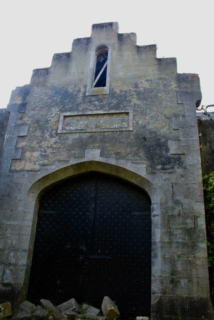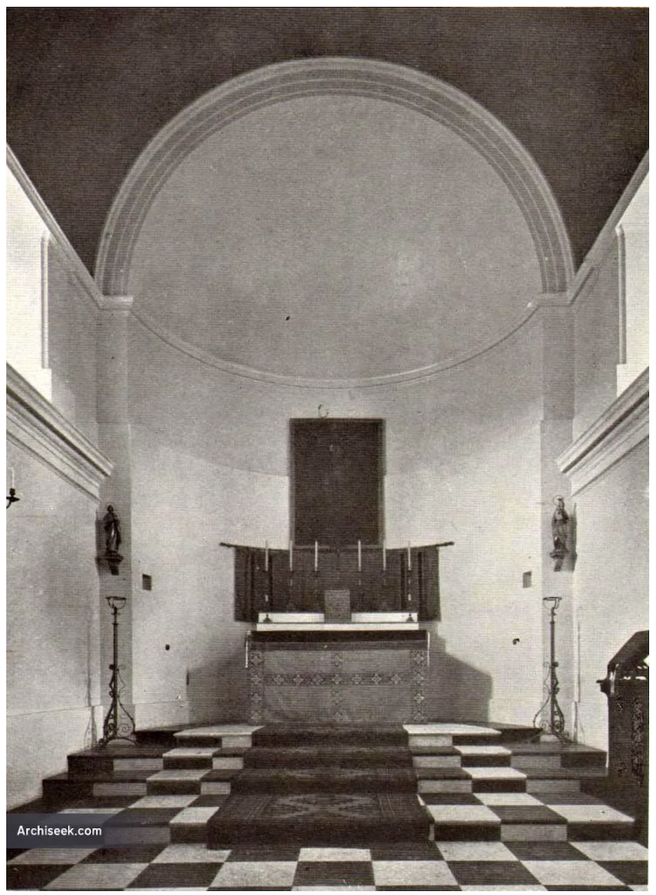 The National Inventory continues: “Single-storey castellated entrance porch with diagonal buttresses surmounted by pinnacles with crockets and finials. Tudor arched opening to porch with label moulding accessed rendered porch with ribbed ceiling, niches to side walls and tooled limestone bell surround and post box flanking door. Square-headed door opening with chamfered limestone surround and label moulding, sandstone threshold and timber double doors.“