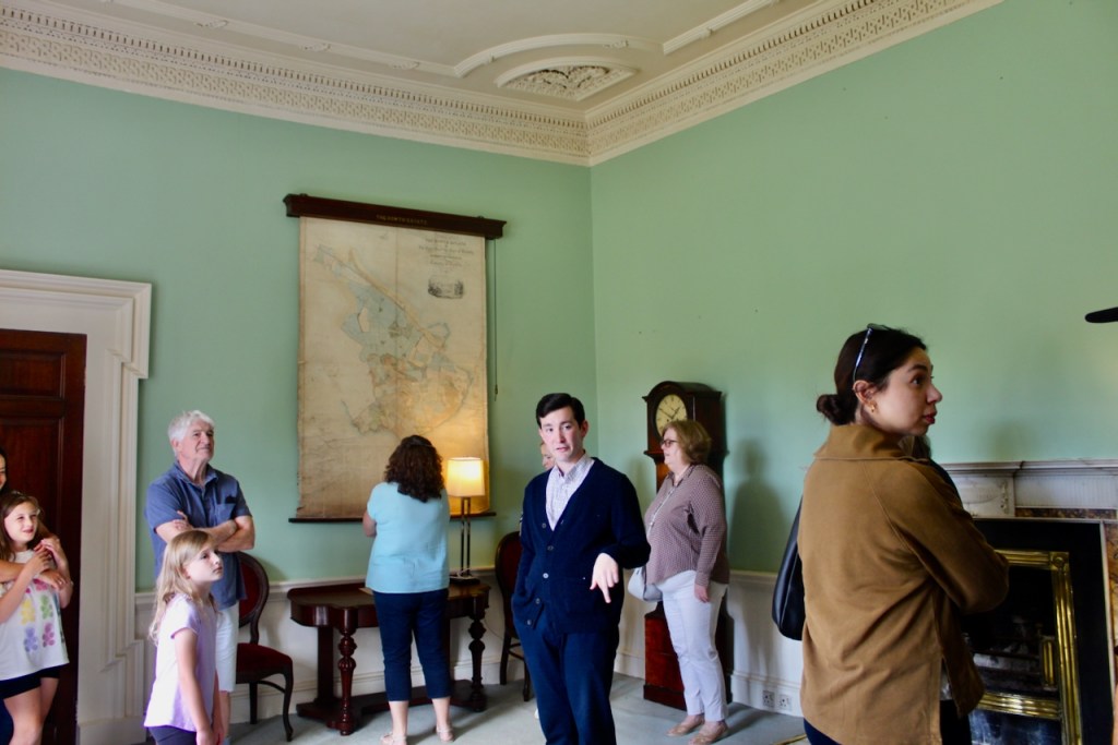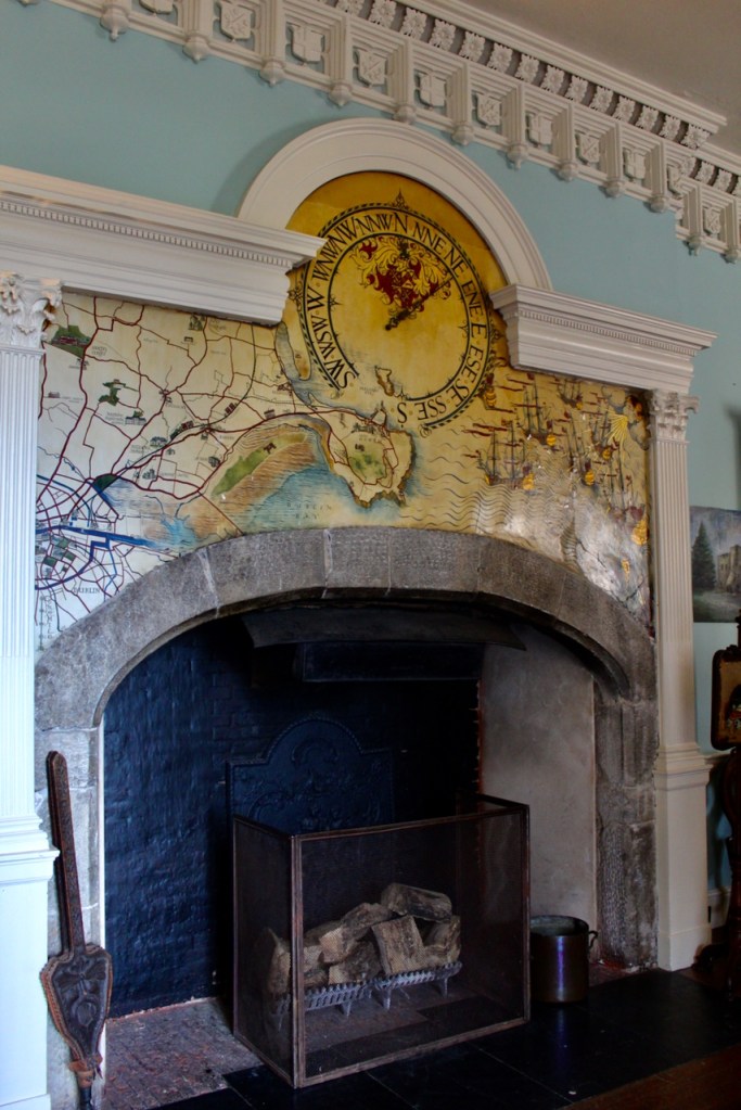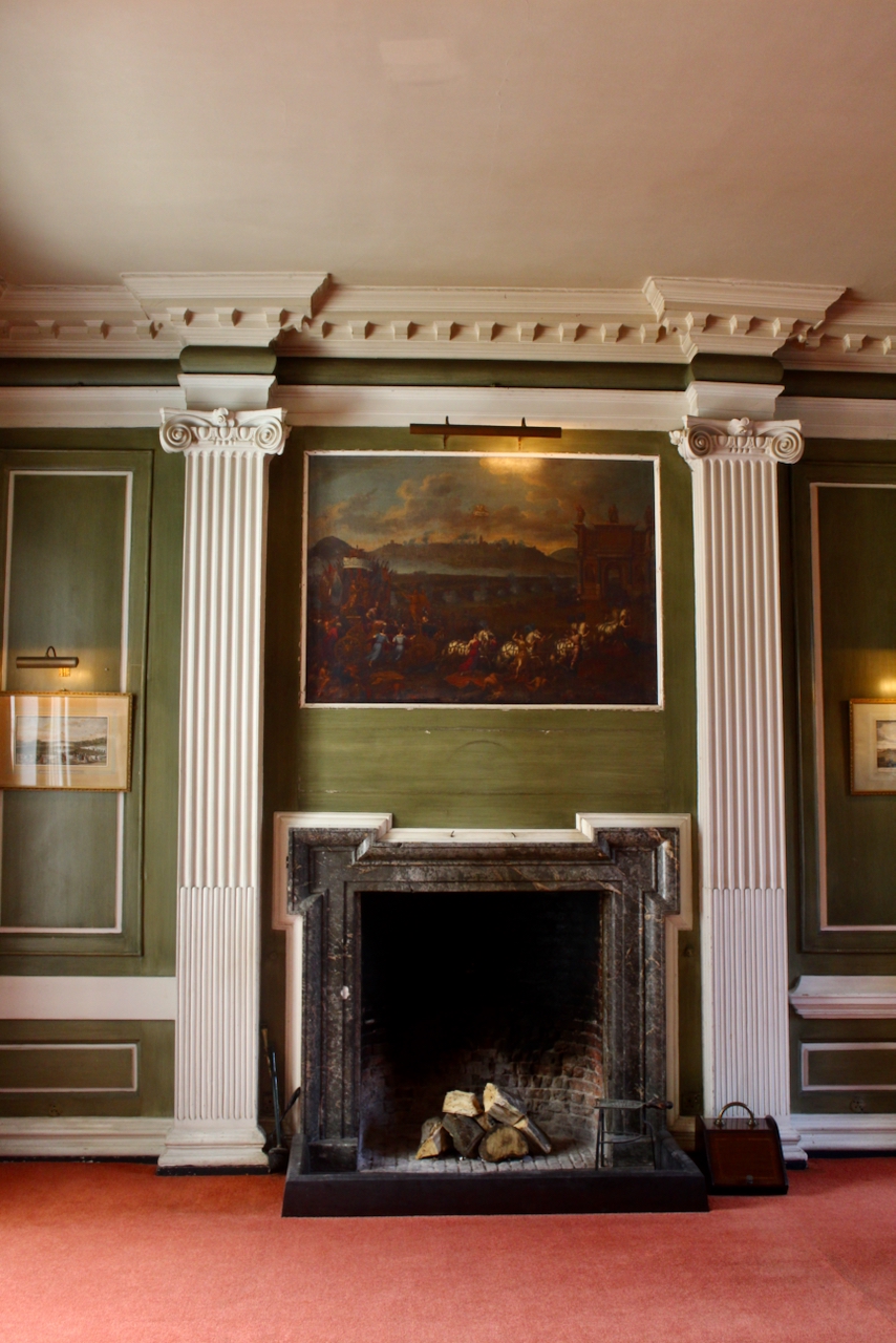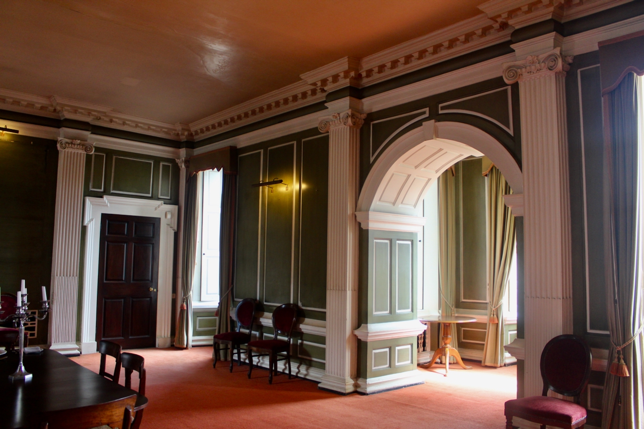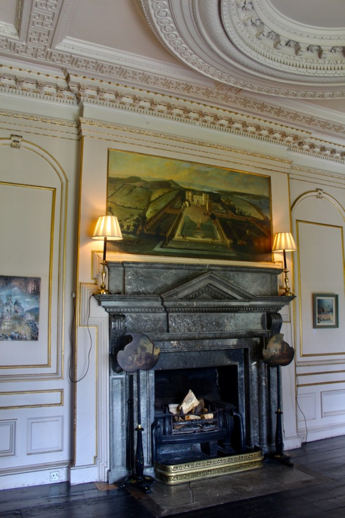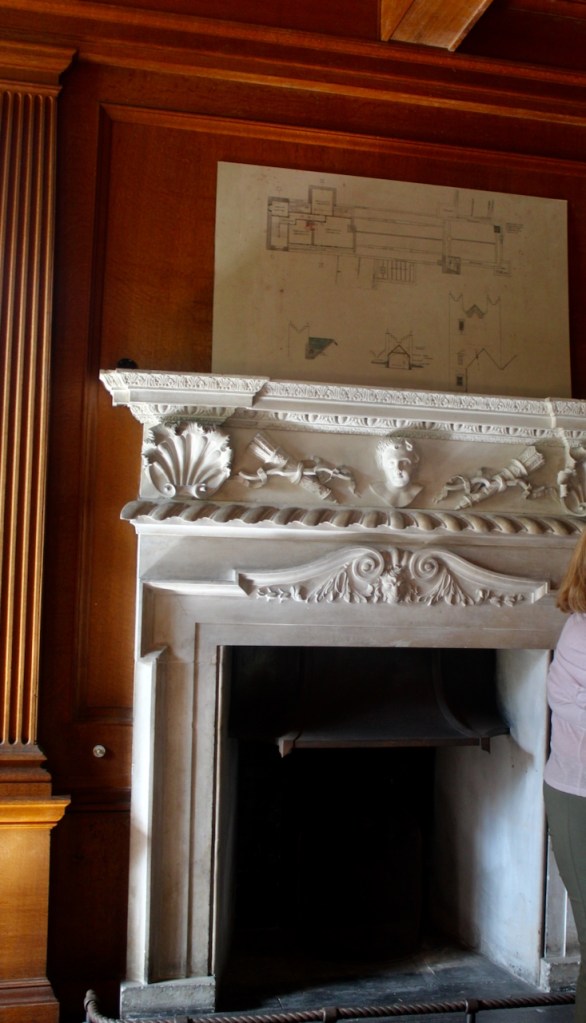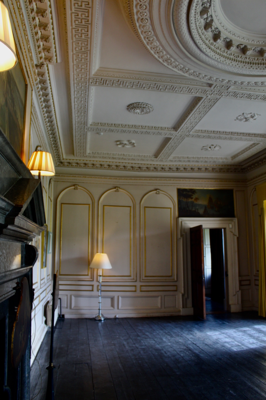 The smaller Dining Room, off the front hall, also has a dummy door. It has a good frieze and cornice, and is the smaller dining room used for family dining. The house retains nearly all of the original chimneypieces. Our guide pointed out that one can surmise the age of the chimneypiece from the width of the mantlepiece. The Georgian mantlepieces were narrow, made to hold a mirror, which was tilted slightly upward to reflect light, and also to reflect a decorative ceiling. Later mantlepieces were made wider in the Victorian age when people liked to display objects.