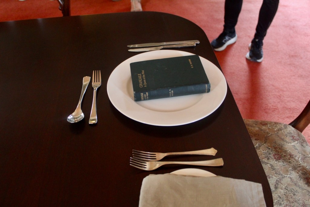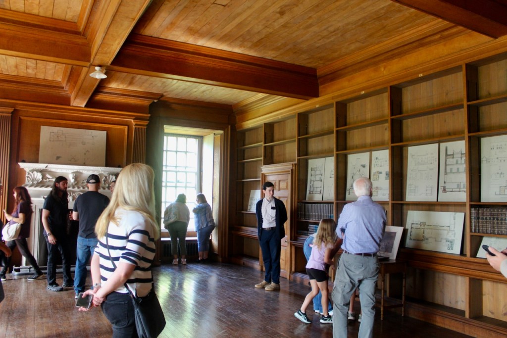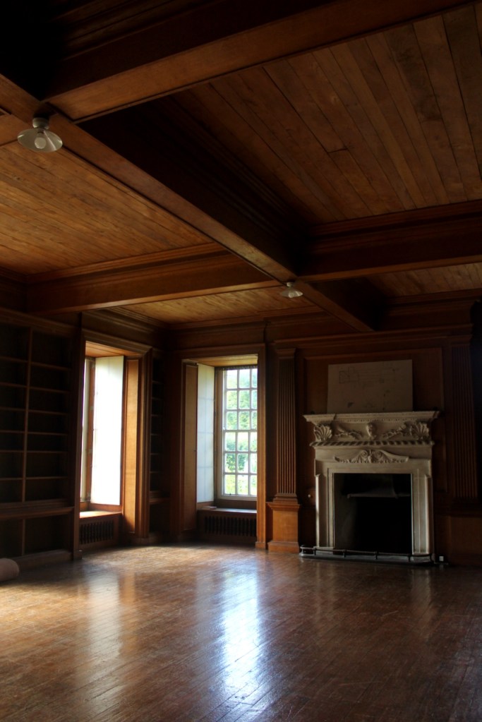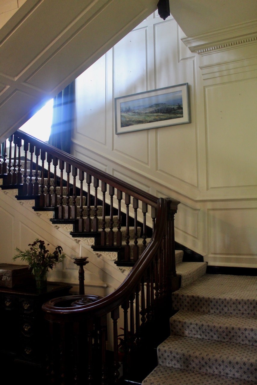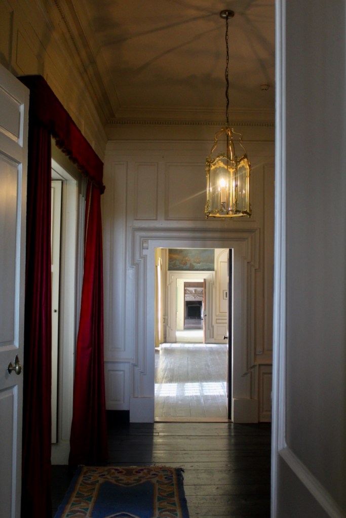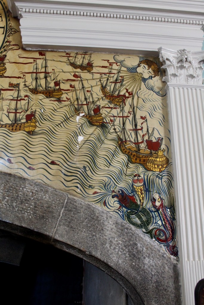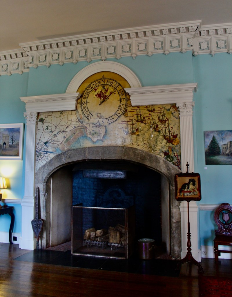 The smaller Dining Room, off the front hall, also has a dummy door. It has a good frieze and cornice, and is the smaller dining room used for family dining. The house retains nearly all of the original chimneypieces. Our guide pointed out that one can surmise the age of the chimneypiece from the width of the mantlepiece. The Georgian mantlepieces were narrow, made to hold a mirror, which was tilted slightly upward to reflect light, and also to reflect a decorative ceiling. Later mantlepieces were made wider in the Victorian age when people liked to display objects.