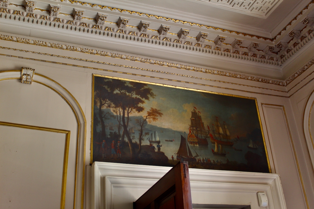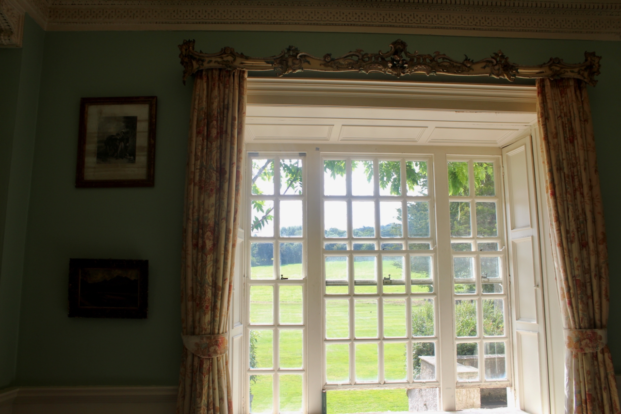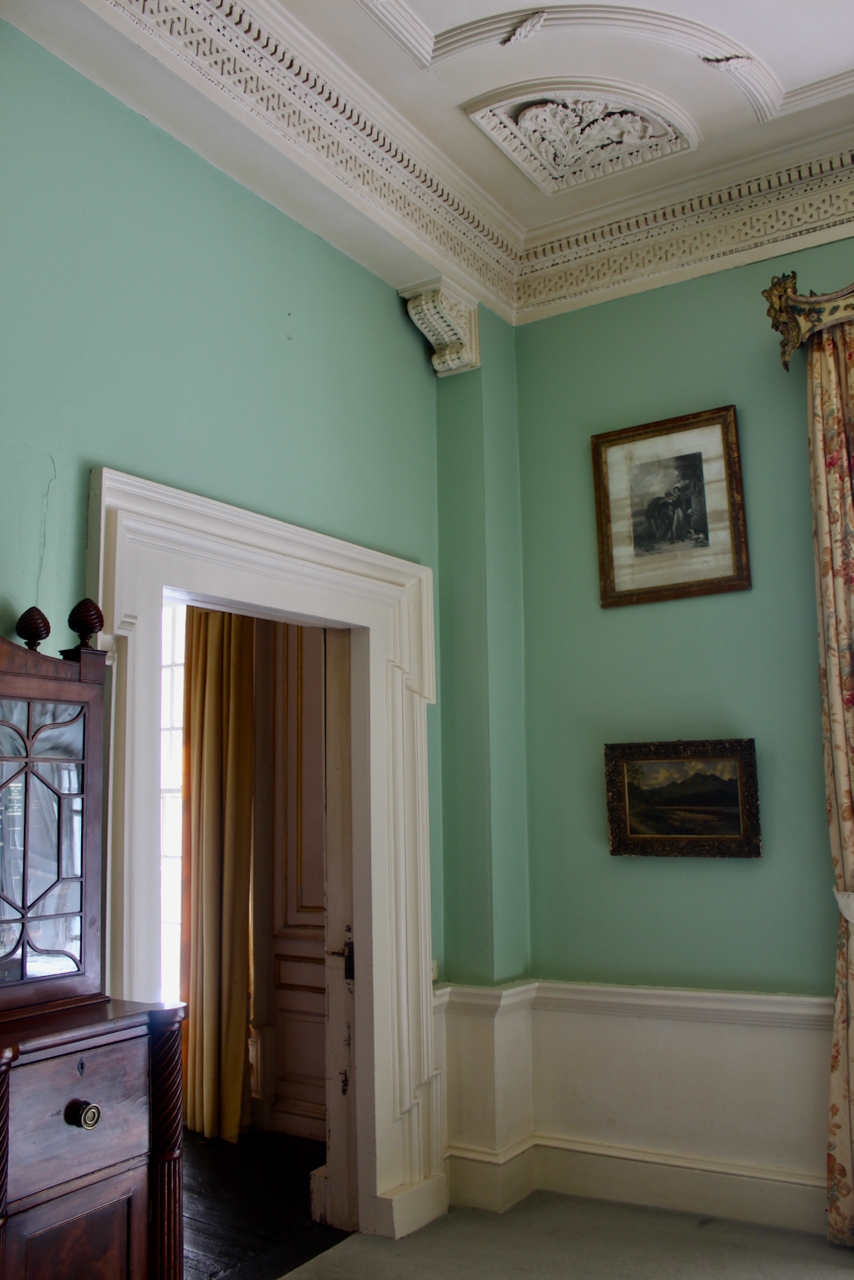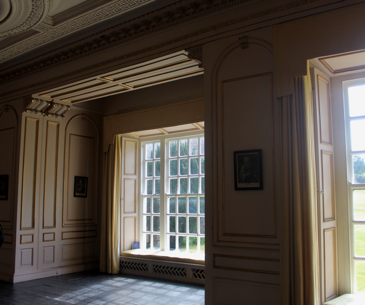 A “jib” door leads to a corridor to the oval room. This room has a portrait of George Marlay, Bishop of Dromore. Musical instruments in the plaster ceiling show that this was a music room. The windows are curved as well as the walls.