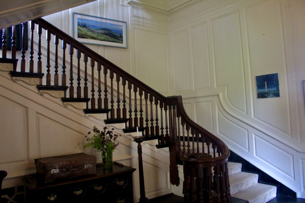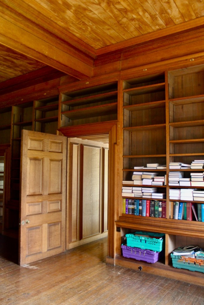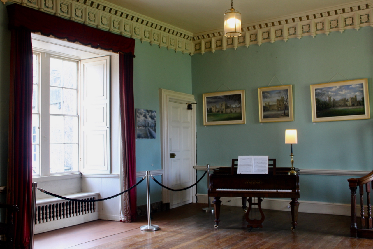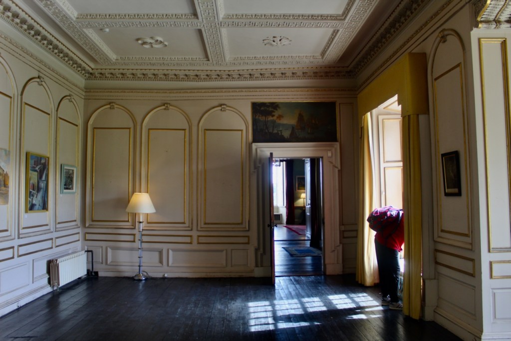There is a small vaulted vestibule off the oval room, which has more decorative plasterwork. Othere rooms include a library and another bow room with a decorative ceiling, which has drawings by the La Touche children. One of the library’s walls is dedicated to work by Evie Hone, since she spent time living and working in the courtyard.