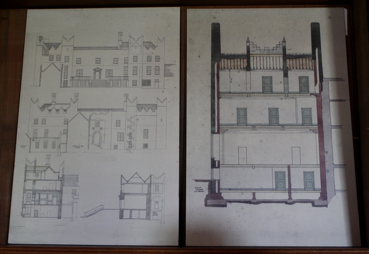 “Ashlar limestone walls with castellated parapet, carved limestone plinth course and continuous string course to parapet. Battered walls to basement level. Square-headed window openings with tooled limestone and sandstone label mouldings, chamfered surrounds and punched limestone sills. Castellated box bay to second bay from north-east rising from basement level to first floor with chamfered stone mullions. Oriel window above entrance added at later date.”