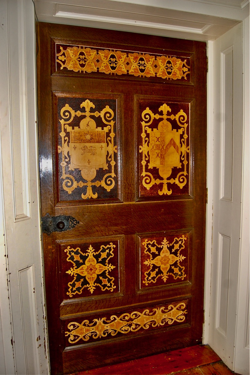 Dora illustrated the doors with crests and intricate patterns, and all of the doors from the room are decorated, along with the shutters. I was delighted when Stephen asked if I could take a photograph of the door – I didn’t like to ask, knowing that most section 482 houses forbid indoor photography. Andrew’s assent typified his warm welcome. You can see photographs of the room, called Dora’s Room, on the Loughton website, along with photographs of the other reception rooms, the Library, Dining and Drawing Rooms. “Dora’s Room” contains a long table and chairs, and an intricately carved fireplace.