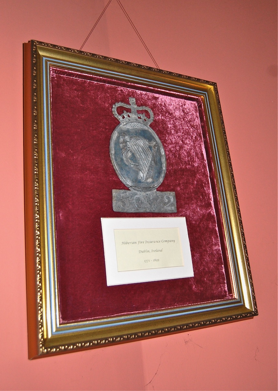 In the Drawing Room, a formal room with sofas, carpets and lovely salmon pink walls, gorgeous cabinets, piano and ornate gilt overmantel mirror, Andrew pointed out another treasure: the fire insurance plaque from a building. The various insurance companies had their own firetrucks and teams, and they only put out fires of the buildings insured by them. Unfortunate neighbours burned down. I was excited to see the plaque as I had seen one on the Patriot Inn in Kilmainham, one of the few remaining, and learned about them in a lecture in Warrenmount in Dublin.