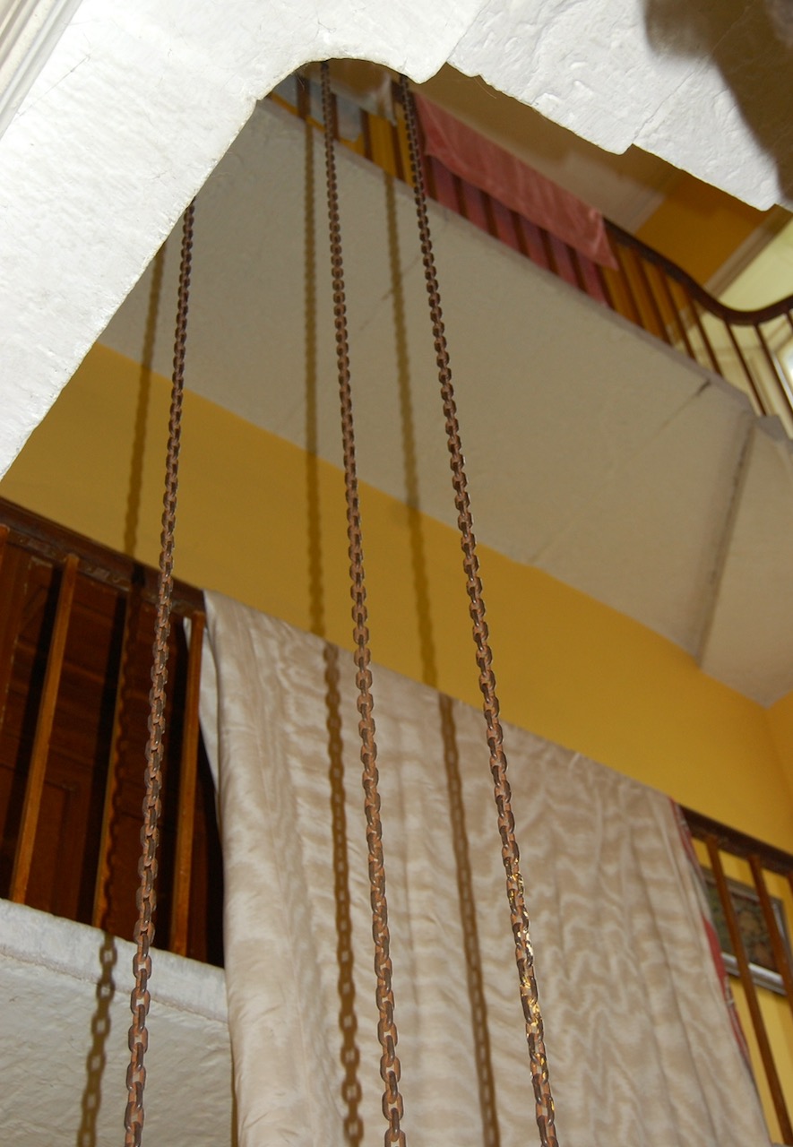 A painting above the door is by Sarah, Lady Langham, an artist, who has also applied her creative skills to the house, and who manages the day-to-day operation of the house. She has made curtains and even the wallpaper of The King’s Bedroom. On our way to the back staircase we ran into Sarah herself, as I was photographing the chain that was used to pull the coal to the upper floors.