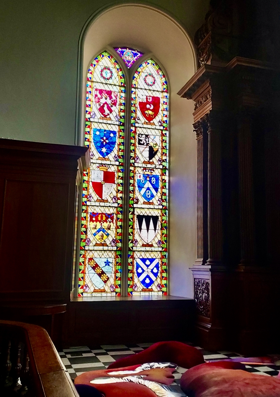 In the fourth wing, not generally open to the public, is the splendid Robinson’s Chapel with a baroque plaster ceiling, carved oak and beautiful stained glass window, and the Geat Hall. You can see an online tour at https://my.matterport.com/show/?m=ce2pG4J1huc&mls=1