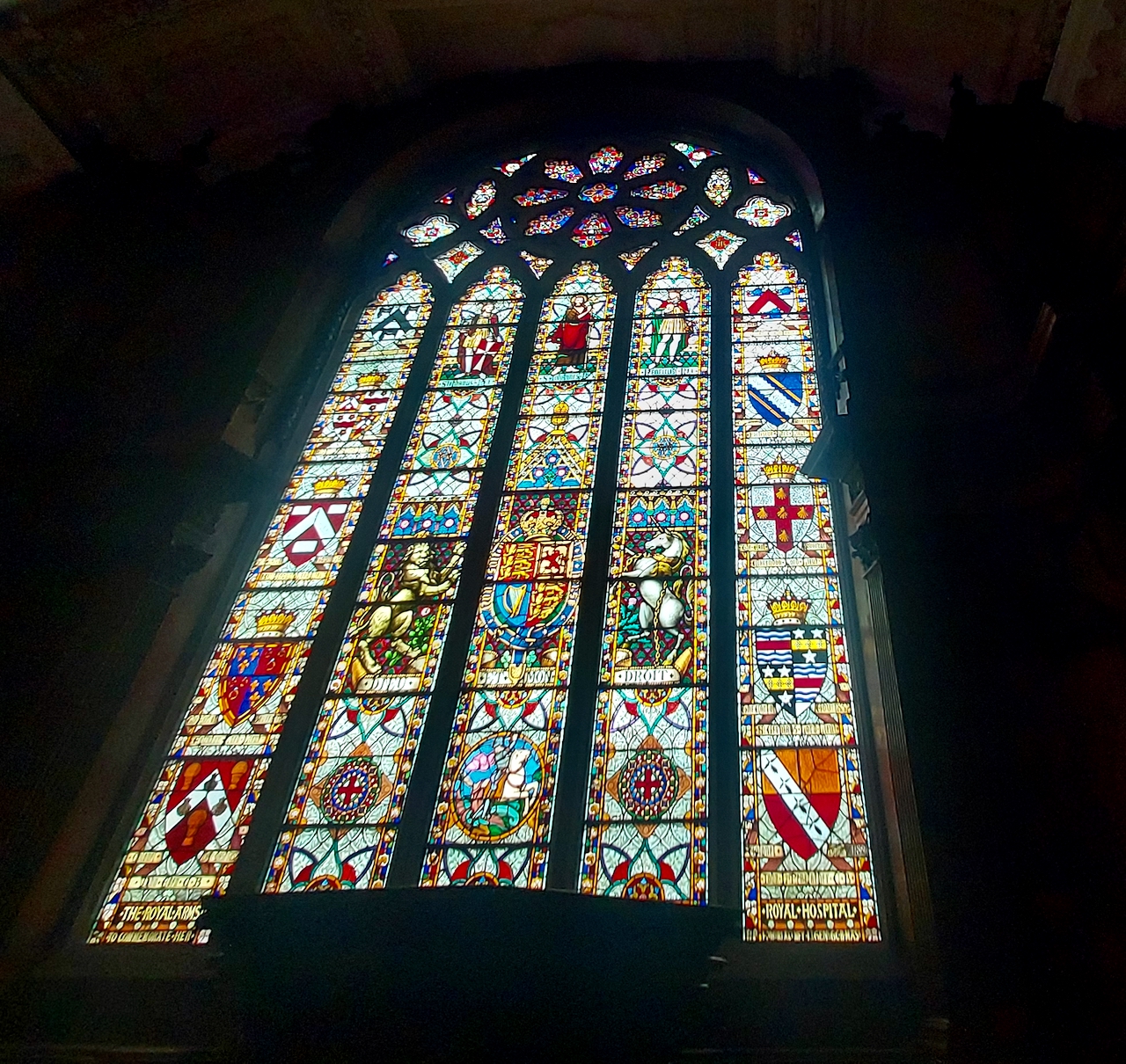 In 1849 young Queen Victoria visited the hospital and bestowed a gift of stained glass which shows the coats of arms of the various Masters of the Hospital, which was made c. 1852 in London by Irish artist Michael O’Connor.