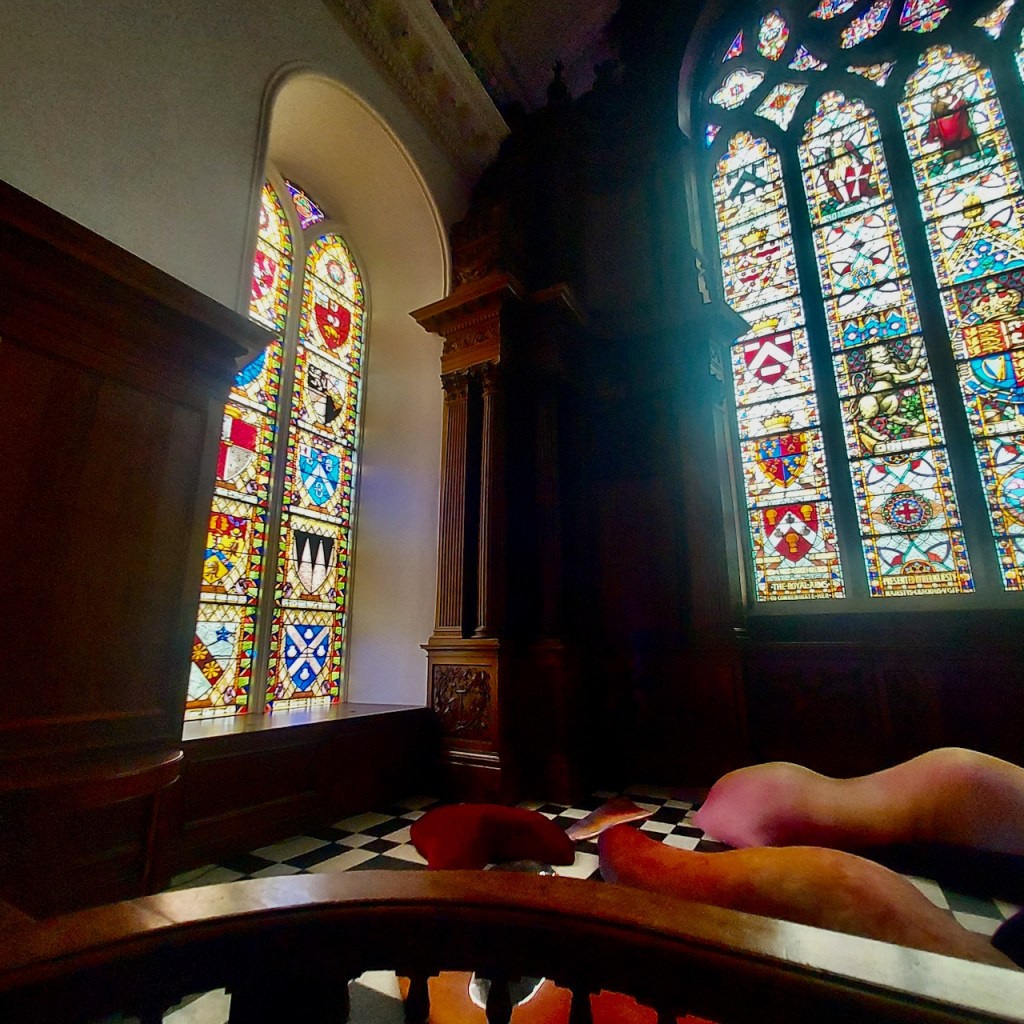 The stained glass in the Chapel’s large east window mostly dates to the 19th century, although some of it is said to come from the medieval Priory of St. John the Hospitaller.