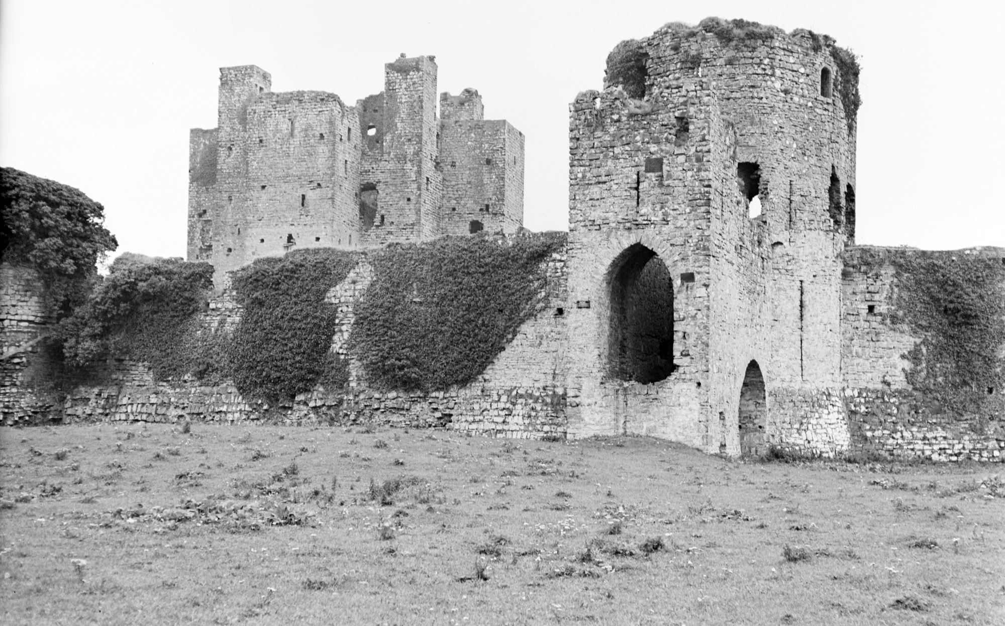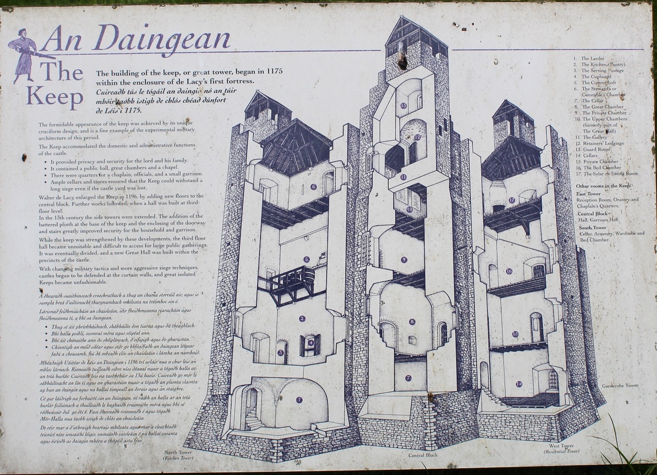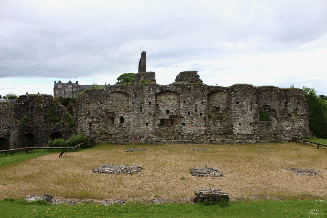 “The large bawn has a round tower on the south east corner and a square tower on the south west corner, castle occupying the north west corner. The north east tower has been removed. In order to accommodate the facade of the house, the northern apron wall was taken down.