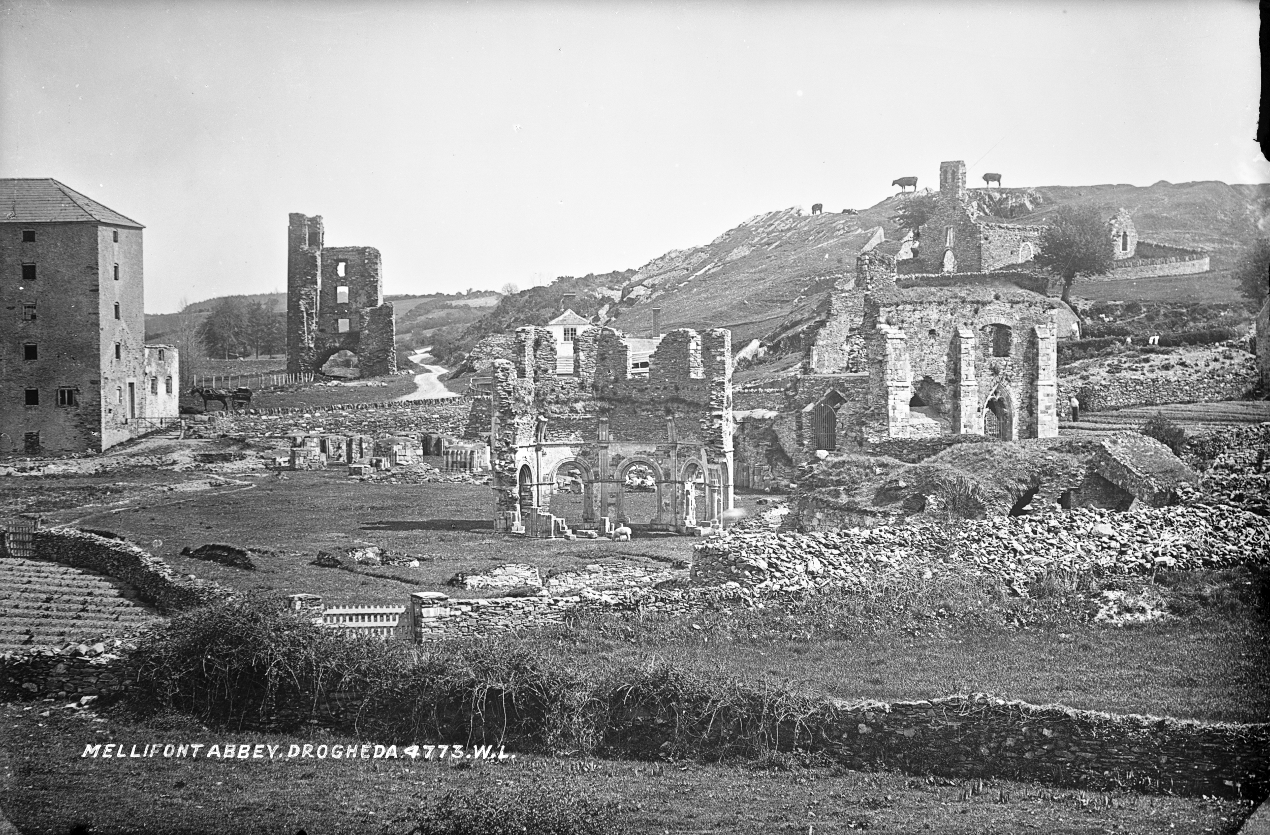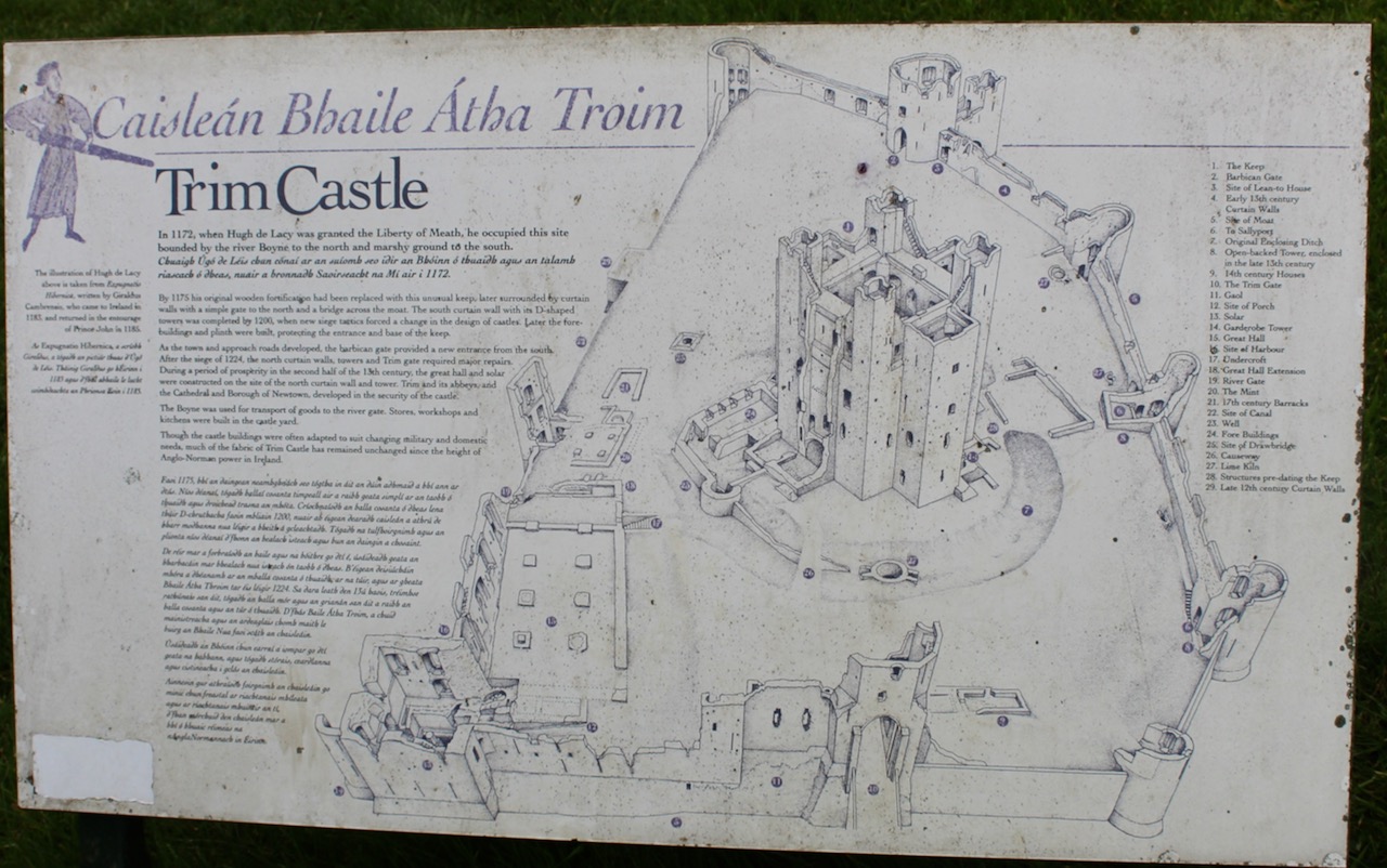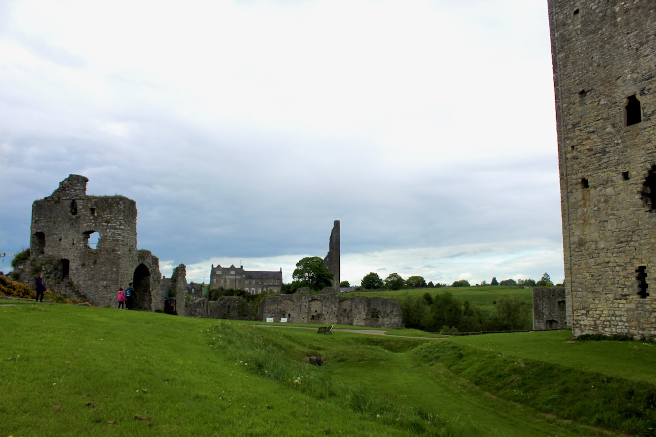 “The large bawn has a round tower on the south east corner and a square tower on the south west corner, castle occupying the north west corner. The north east tower has been removed. In order to accommodate the facade of the house, the northern apron wall was taken down.