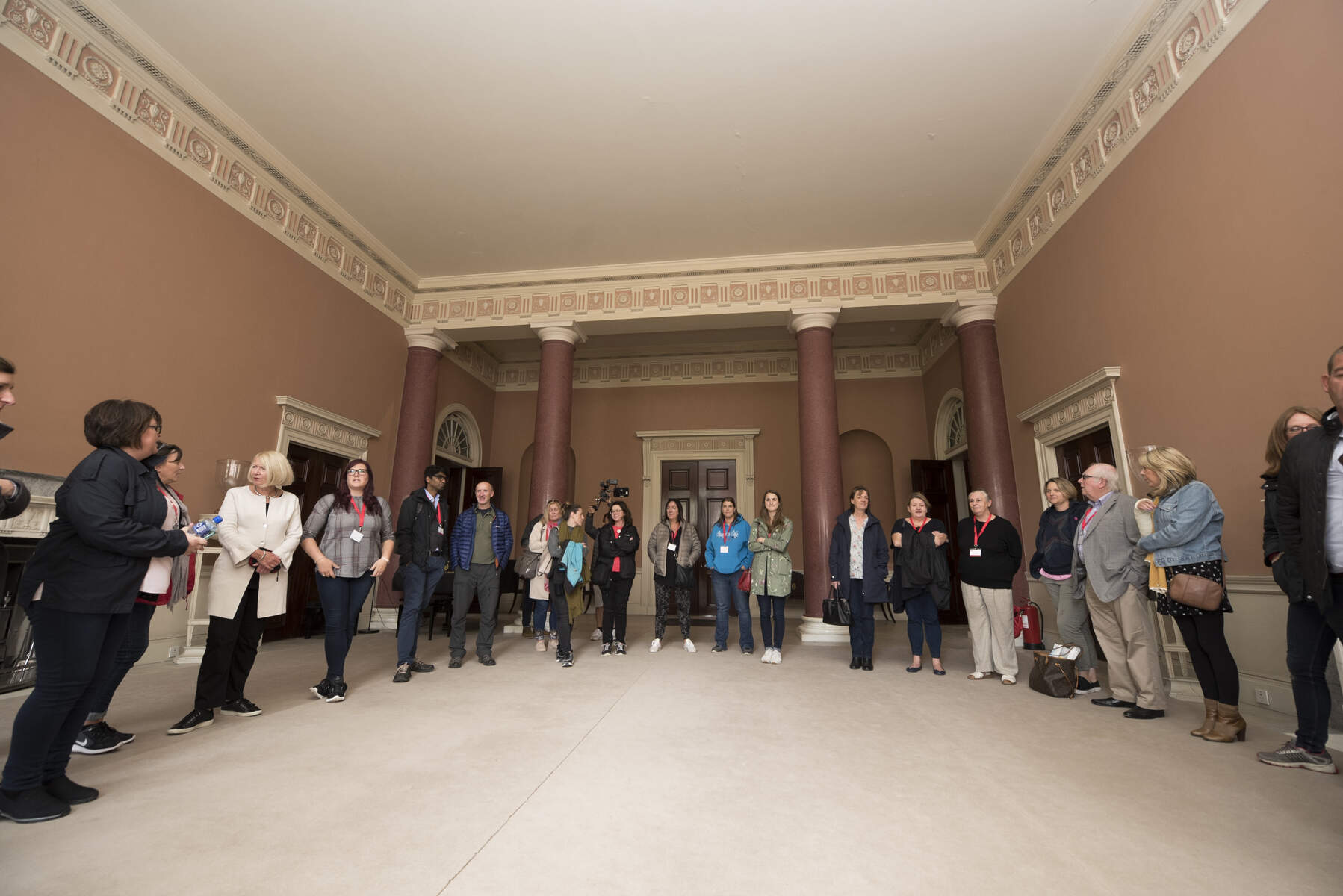 Castle Coole, Fermanagh, Tourism Northern Ireland 2018 (see [1]). It has a wonderfully large front hall, intended to resemble a Roman atrium, with scagliola (imitation marble, the recipe for scagliola died with the man who created it) Doric columns and lovely plasterwork, which matches the Carrara marble fireplace. Specialist plasterers under Joseph Rose created the decoration to the ceilings and walls; marble chimneypieces were commissioned from Richard Westmacott and Domenico Bartoli created scagliola columns and pilasters.The rosettes in the frieze are from an old Corry coat of arms, and chalices are from the Lowry coat of arms.