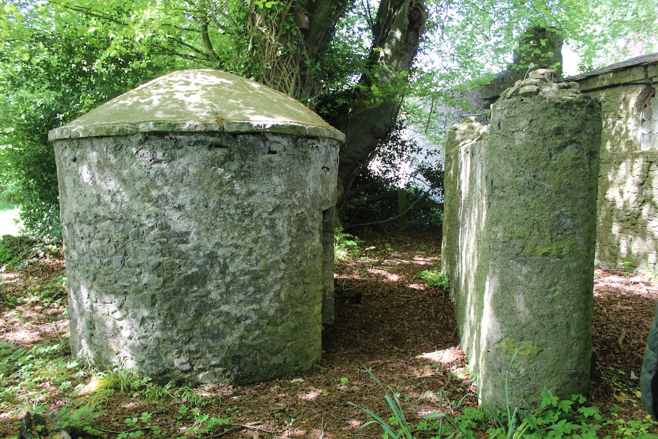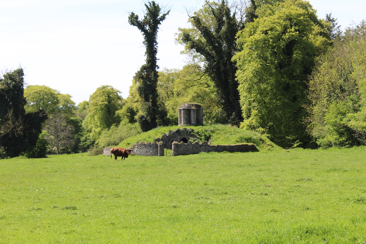 The National Inventory calls it a Mausoleum: “Mausoleum and folly, built c.1820. Comprising three-bay single-storey dressed limestone façade set into artificial mount, with rustic temple set on the mount. Pointed arch openings to three-bay façade. Rubble stone walls to site, with circular profile piers. Circular profile temple, comprising six columns, capped with dome. Rubble stone bridge to the site.” [9]