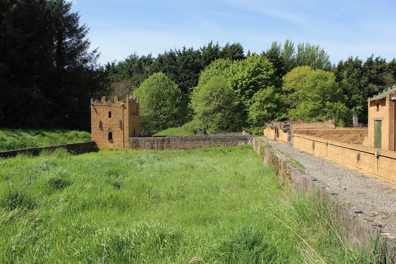 At the north west corner of the restored Walled Garden the Shell Tower is a three storey, battlemented tower with single arched Gothic windows.