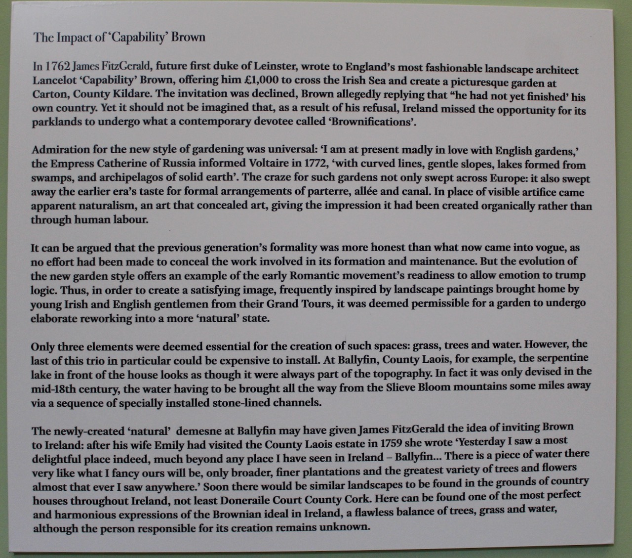 I recently visited the exhibition of “In Harmony with Nature: The Irish Country House Garden 1600-1900” at the Irish Georgian Society, curated by Robert O’Byrne. He describes the Romantic movement and landscape design of Capability Brown: