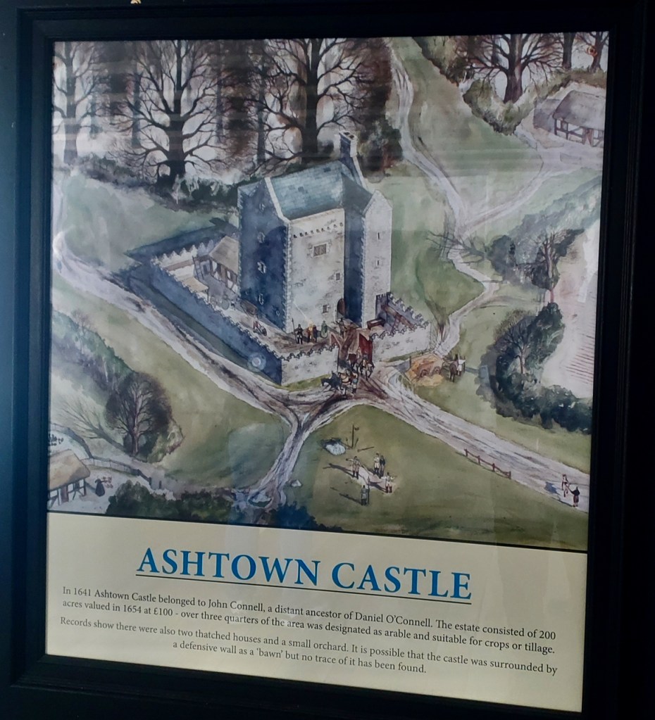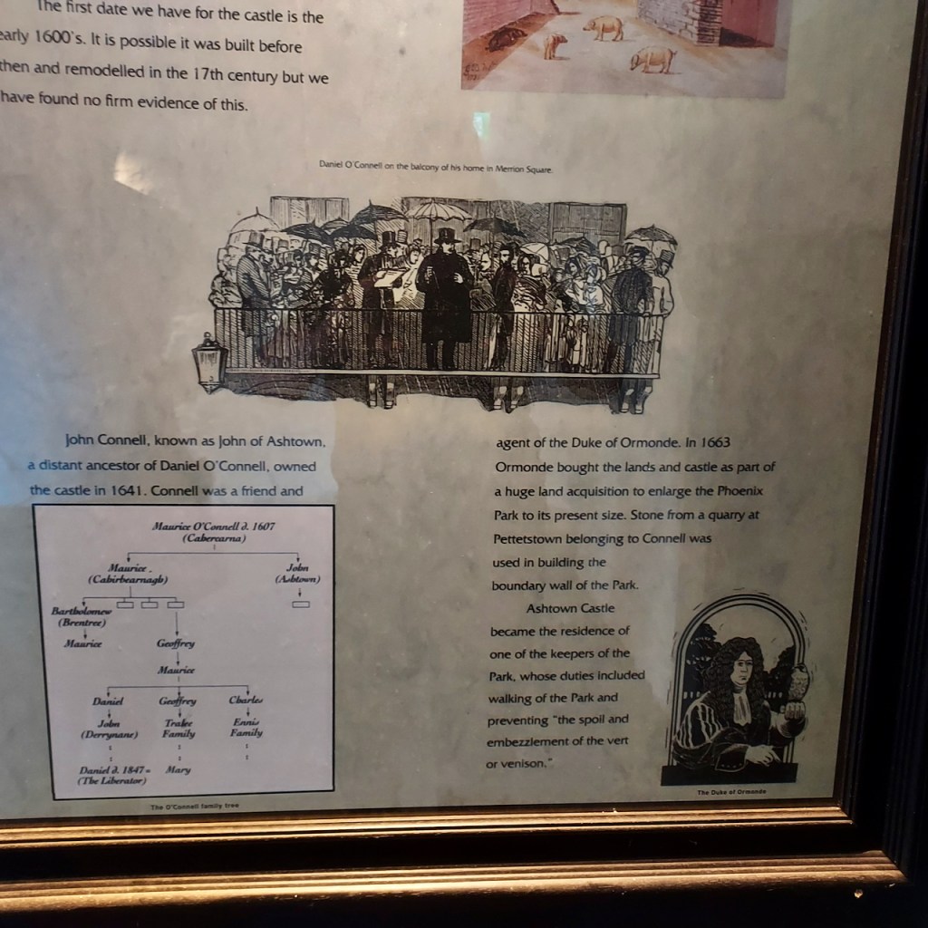 “The castle was dated to the early seventeenth century on the basis of surviving fragments of a roof truss found in the wall during the restoration project in the early 1990s. There is in the stonework some suggestion of a further wing to the north, but no archaeological evidence was found, leaving this section unresolved. The builder is unknown, but in 1641 the estate was in the ownership of John Connell, a distant ancestor of Daniel O’Connell. Curiously the Civil Survey, 1654, lists him as a Protestant. Stone from a quarry at Pelletstown owned by Connell was used in the building of the original wall of the Park.”
