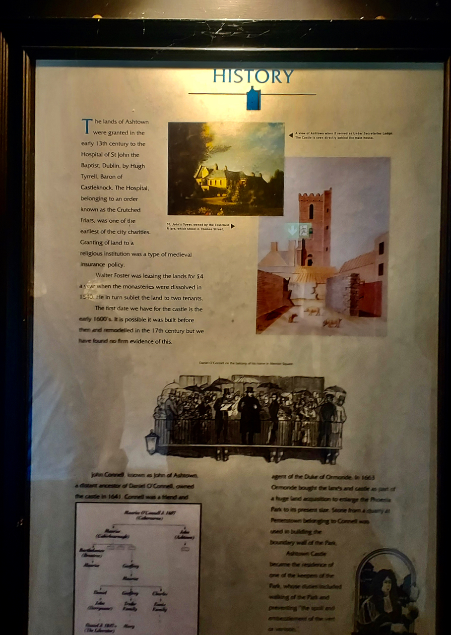 The land at Ashtown, now part of the Phoenix Park, was granted by Hugh Tyrrell to the Hospital of St. John the Baptist in the 12th century. The Hospital belonged to the “Crutched Friars” (brothers of the cross) and was one of the earliest city charities.