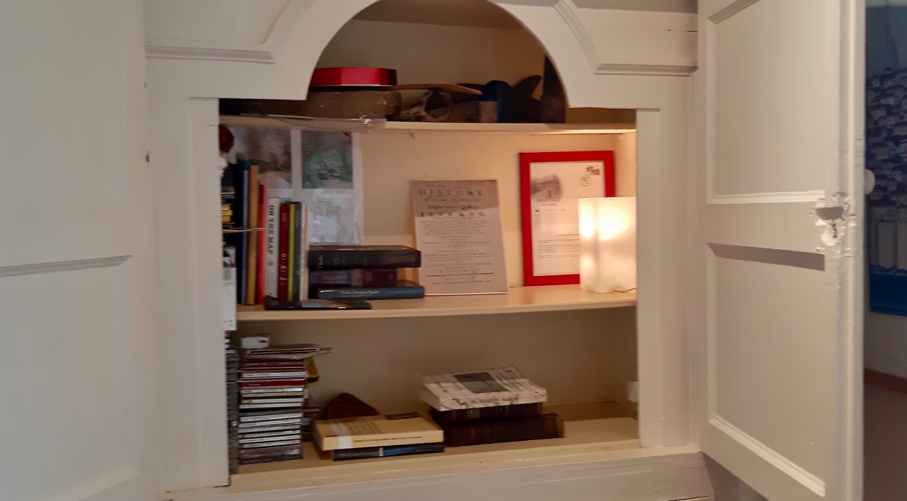 In the last room of the tour, now the family sitting room, there is a wonderful old original cupboard, which contains more Quaker history, which Philip calls the “Minutes cupboard,” as it may have held the minutes of meetings. This cupboard is original to the house, as are the window shutters and doors.