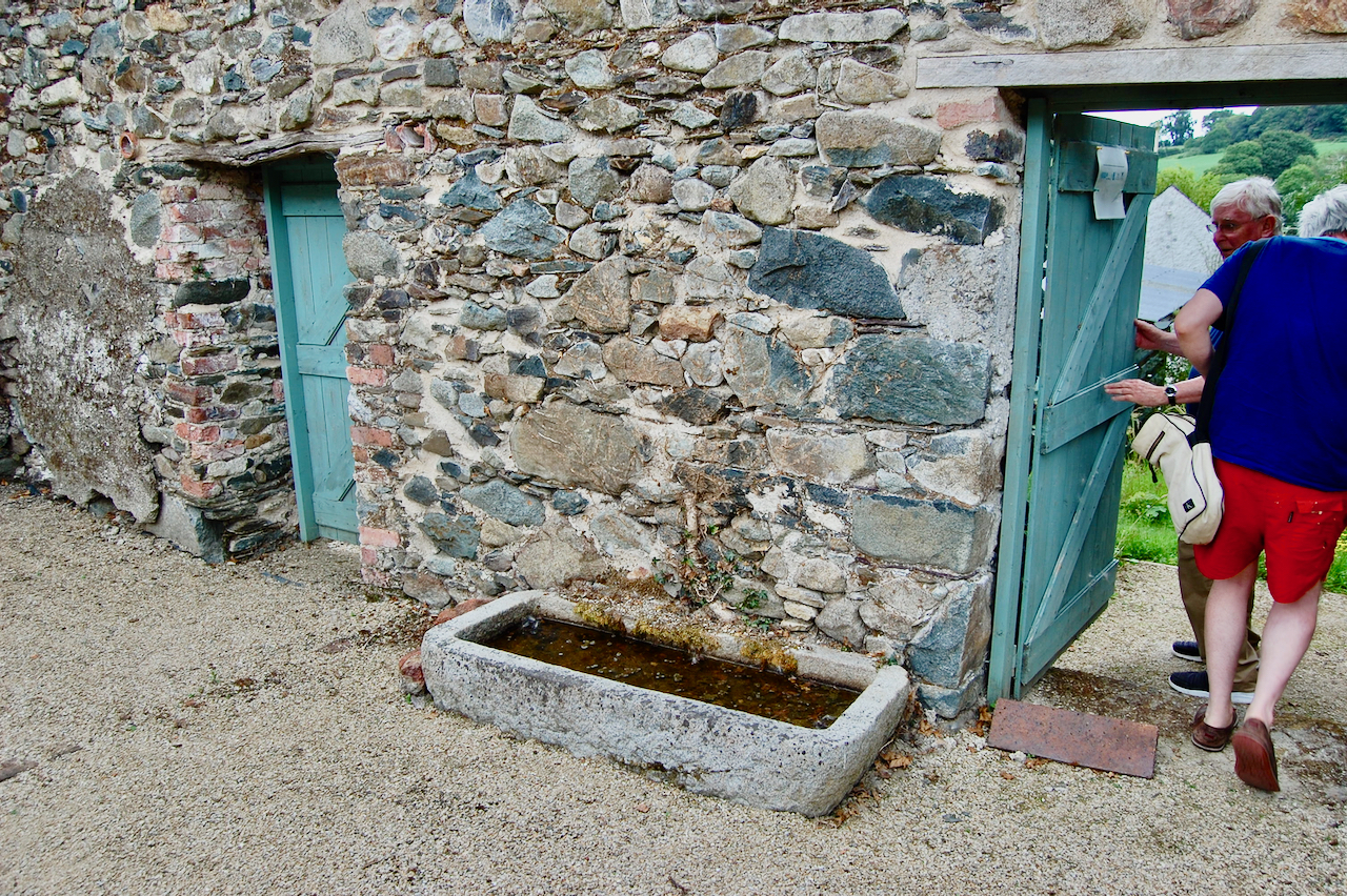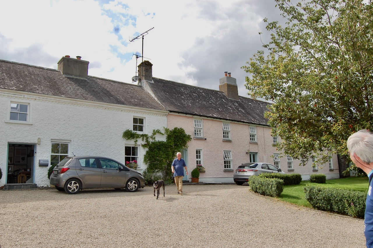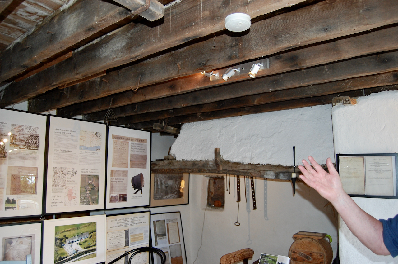 Philip was friendly and delighted to welcome a Quaker. The house was built in around 1668, and was formerly a pair of houses, according to the National Inventory of Architectural Heritage. [1] On the Ballymurrin website, the part of the building with the pink painted exterior is identified as the farmhouse, and the white end is the coach house and forge. The pink part of the house was originally two dwellings: a five bay main house, and a dower house of two bays. We did not get to see inside the Dower House, which is now called Box Tree Cottage in honour of a tree in its garden, but you can see pictures on the Ballymurrin website. The buildings form a U shape around a yard, although the buildings to the right hand side when facing the house have not yet been renovated, although they have been stabilised. These would have been the stables. On the left hand side of the U is what was formerly the milking parlour. [2]