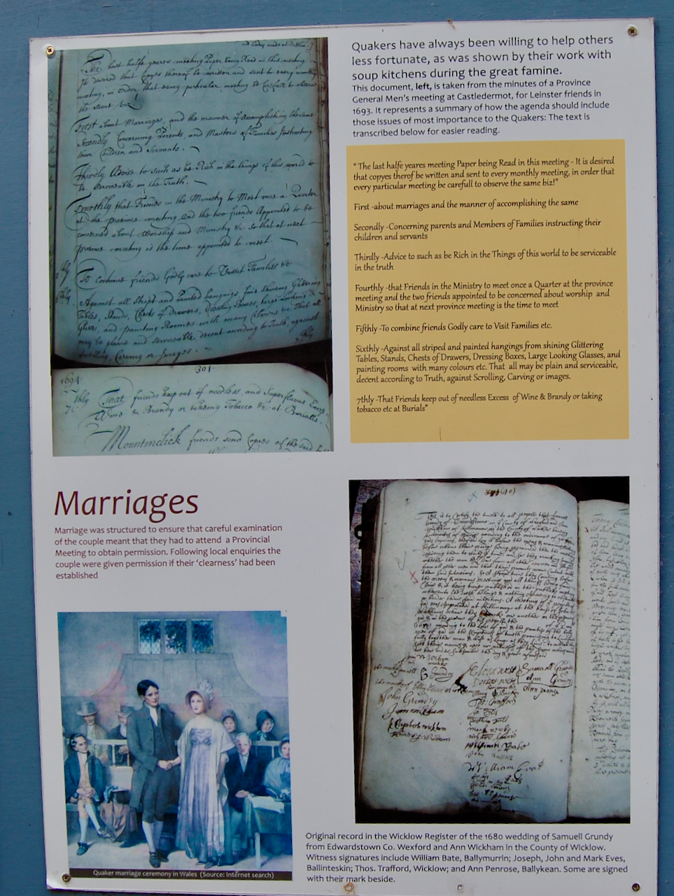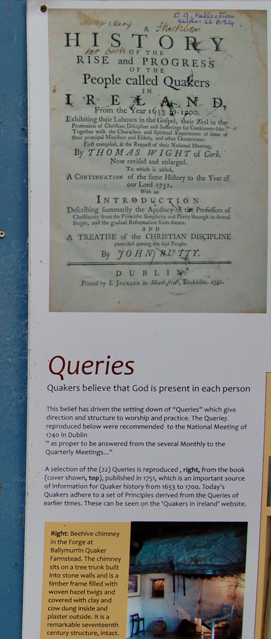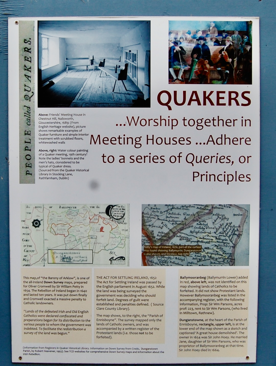 Ambrose was “convinced of the blessed truth” in 1672, i.e. became a Quaker. “Convincement” is when a person realizes that he or she wants to join the Quakers (“Convincement” and officially becoming a Quaker don’t necessarily happen at the same time. Nowadays a person attends Quaker meetings for years before applying for membership). The next information board tells us that Ambrose Judd had to pay for his Quaker faith, with hay and barley, wheat and oats. These were “forcibly recovered,” taken as tithes to be paid to the established church, the Church of Ireland. Catholics also had to pay these tithes. Quakers refused to pay the tithes, so a “tithemonger” took the goods, and refusing to pay tithes would be a reason that Quakers were put in gaol.