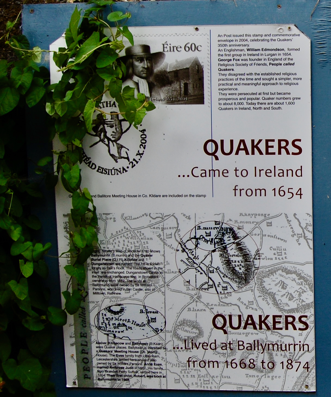 Philip has done much research to establish who lived in Ballymurrin. In this 1760 map pictured above, Ballymurrin is identified, and a Quaker Burial place in Kilbride. There is also a Quaker meeting house in Ballykean. Quakers do not have church “services” or masses, they have “meetings,” which are mostly silent.