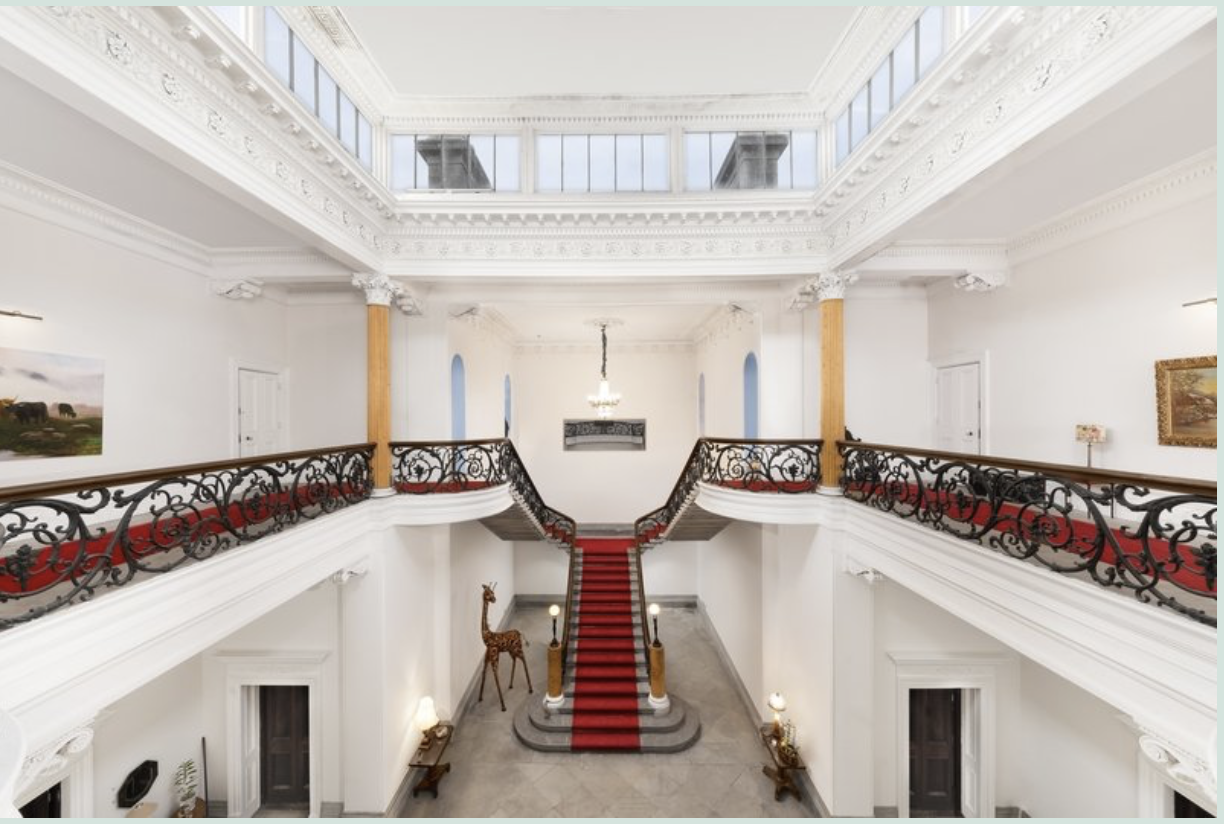 “The house is comprised of a ground floor and a single upper storey, with a long, slightly lower, service wing to one side in lieu of a basement. The facades are rendered with cut-granite decoration, including a grandiose central porch, supported by six Tuscan columns and surmounted by an elaborate balustrade, which projects to form a porte cochère.”