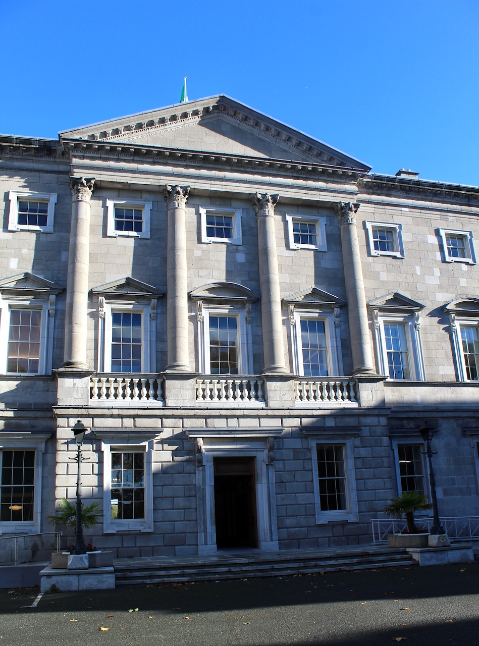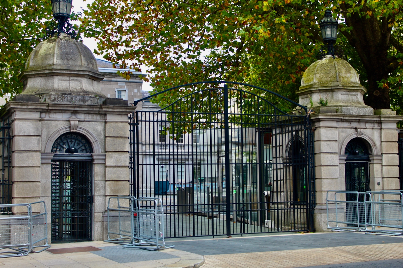 In the Malton drawing of Leinster house we can see that the side walls of the forecourt had pedimented arches. The present piers, wrought iron gates and railings were added in the 1880s, built by T.N. & T.M. Deane.