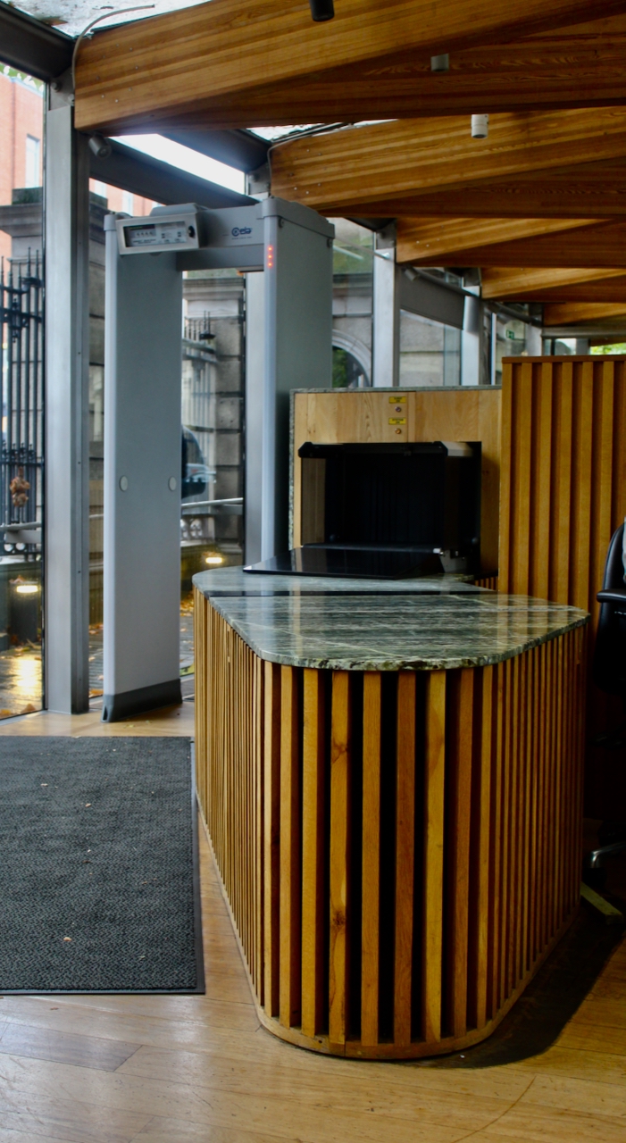 To enter Leinster house, you go through a security hut upon which a controversial sum was spent by the Office of Public Works. I love the way the hut goes around a large tree. I assume a large part of the cost of the hut was the beautiful marble countertops!