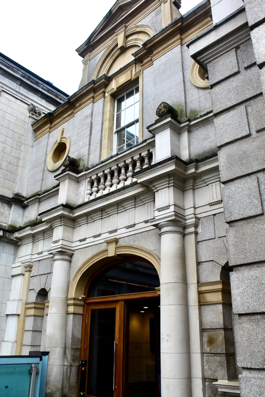 The centre block has a balustraded balcony, and the attic and ground floor windows have lugged architraves: the architrave is the classical moulding around the window and “lug” means ear, so the windows have “ears,” otherwise called shoulders. The term “Lugs” was made famous as a nickname for a policeman in the Dublin Liberties, “Lugs” Branigan, a man known for his sticking-out ears. A heavyweight boxing champion, he had a reputation as the country’s toughest and bravest garda. The ground floor windows have are topped with a further cornice – a horizontal decorative moulding.