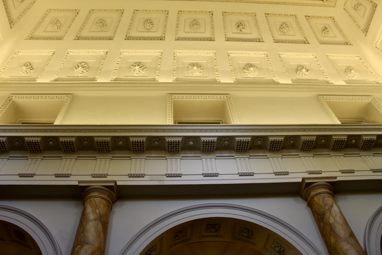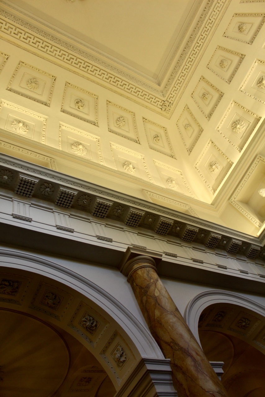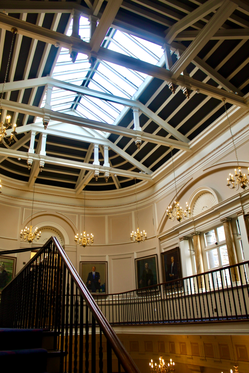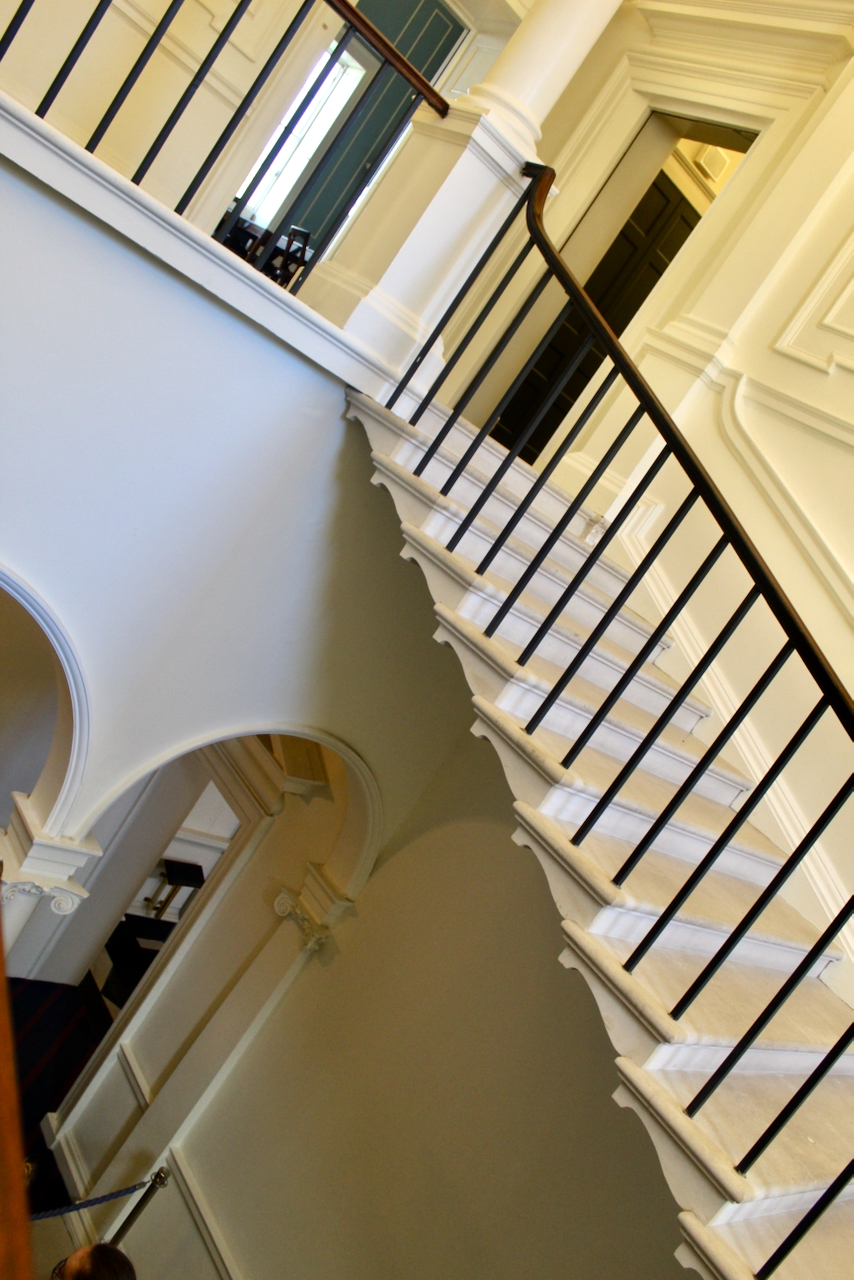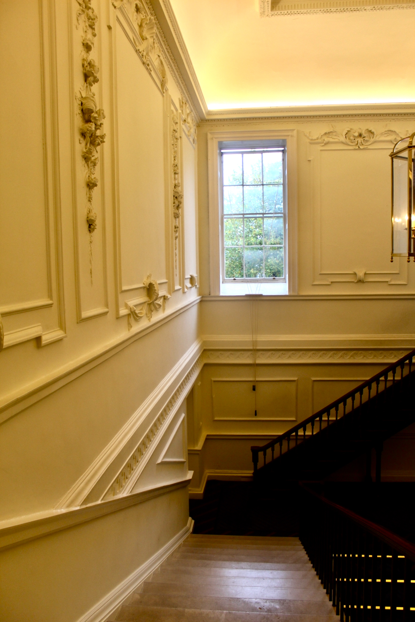 Inside, the house has a double height entrance hall with an arcaded screen of Doric pillars toward the back which opens onto a transverse corridor that divides the front and rear ranges. I found the hall hard to capture in a photograph, especially as we were part of a tour group. The hall reminded me of the double height entrance hall of Castletown, and indeed Christine Casey notes in her Buildings of Ireland: Dublin that the plan and dimensions of Leinster House relate directly to those of Castletown house in County Kildare, which was built in 1720s for William Conolly, and which was probably, she writes, built under the direction of Edward Lovett Pearce, possibly with the assistance of Richard Castle. [2]