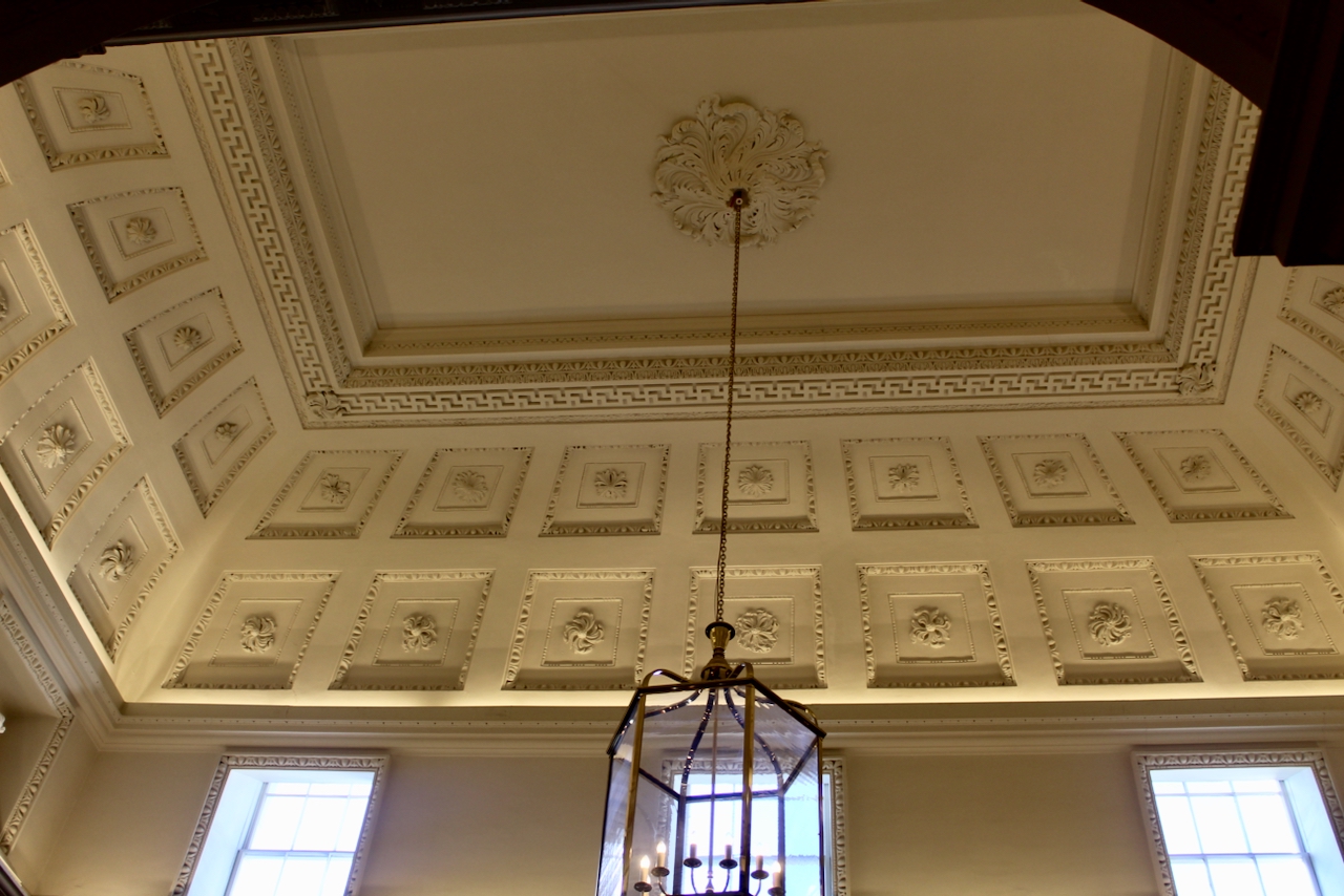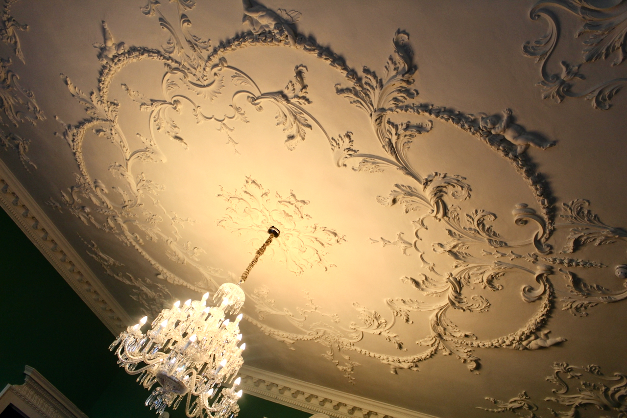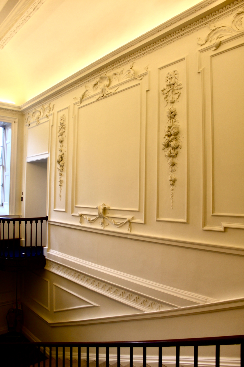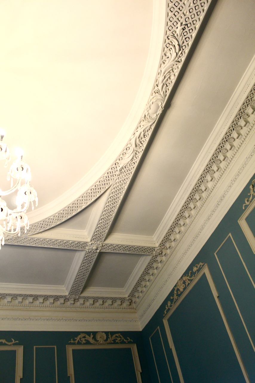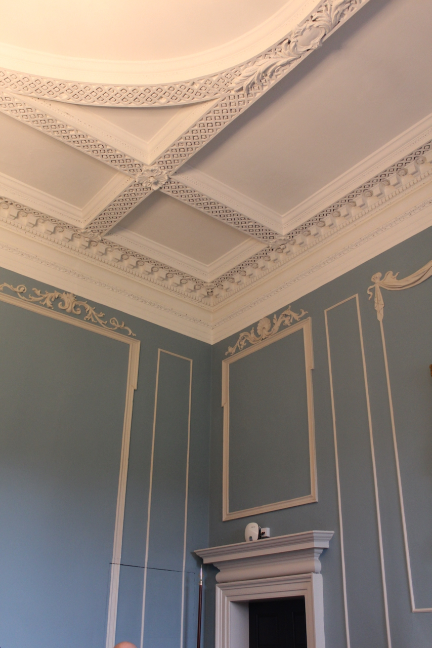 [8] Other work by Michael Stapleton can be seen in Marlay House in Dublin, several houses in North Great George’s Street including Belvedere House, Powerscourt Townhouse, 59 South William Street, Dublin 2 and in Trinity College Dublin, especially in the Exam Hall and the Chapel. Note that Stapleton was the executor of Robert West’s will, and may have trained with Robert West. We came across Robert West’s characteristic stucco work in Colganstown.