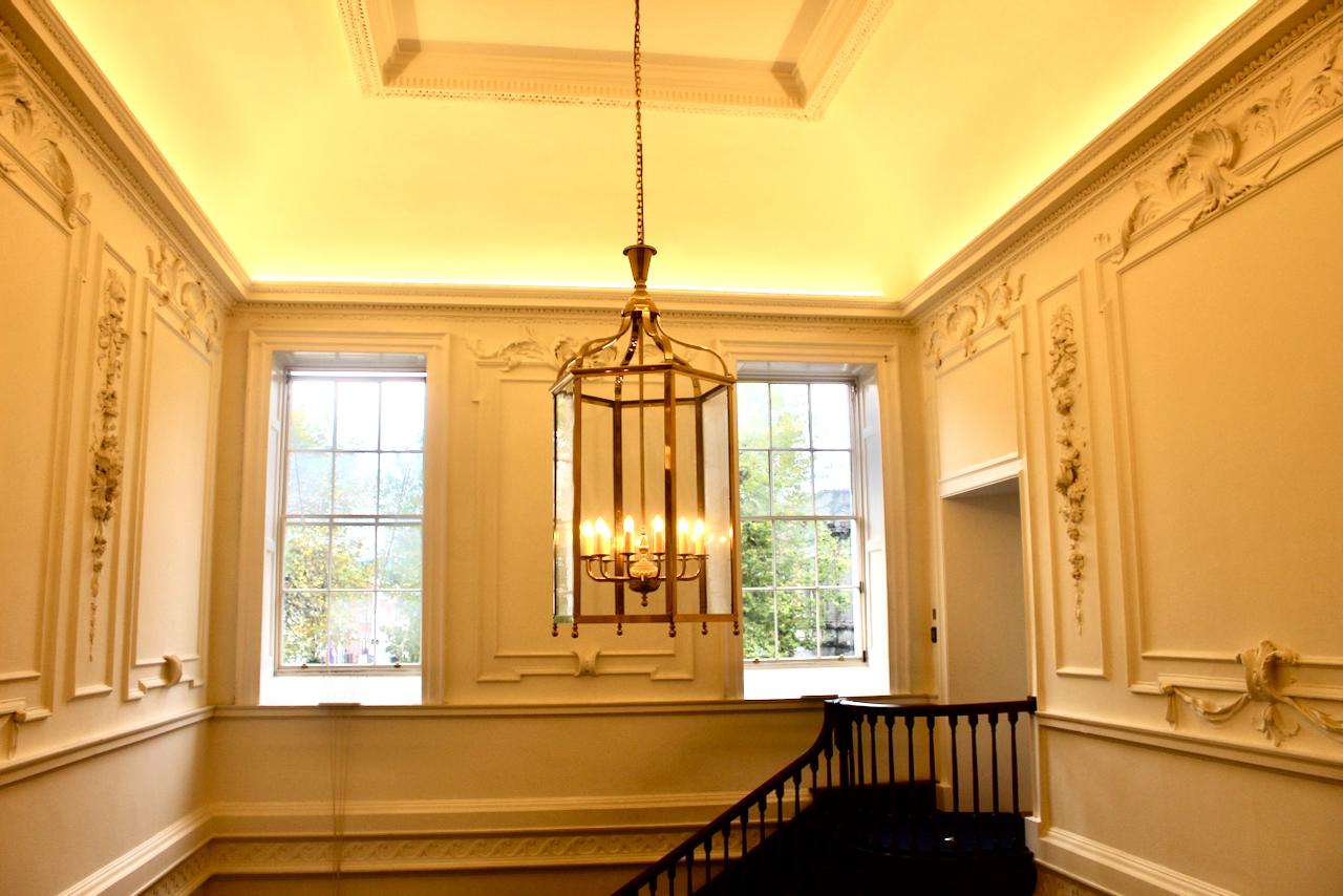 “at its centre a chamfered octagon within a square and at each end a diaper within a square, each flanked by broad figurative lunette panels at the base of the coving and bracketed by attenuated tripods, urns and arabesque finials… It remains among the finest examples of Neoclassical stuccowork in Dublin.“