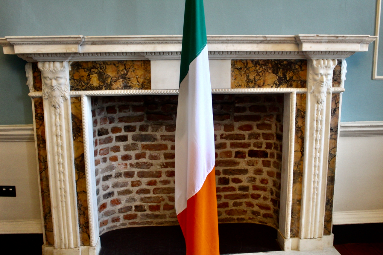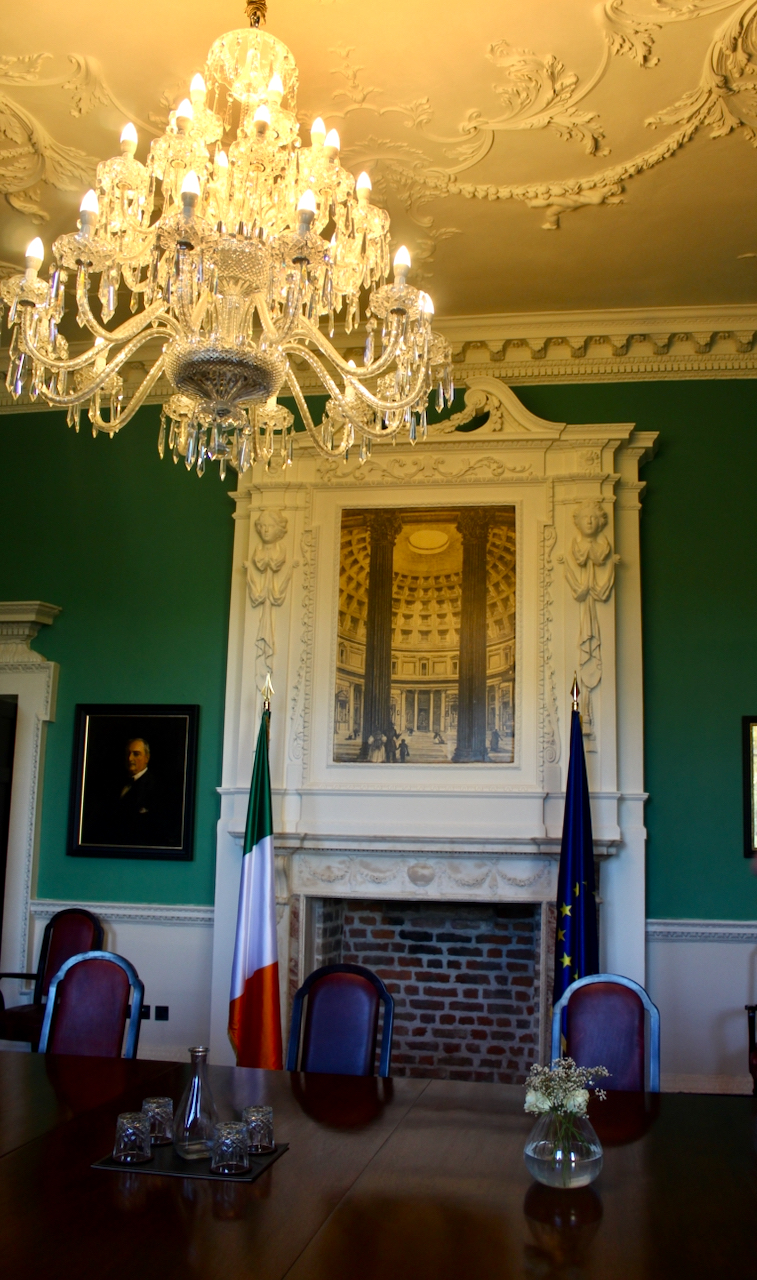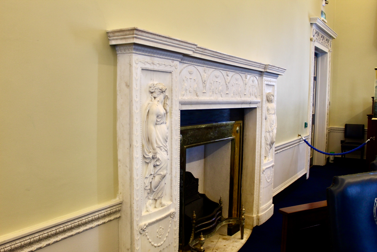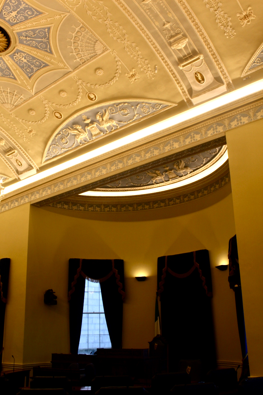 Before we go into the separate building that holds the current Dáil chamber, let us go up to the first floor. The former gallery now holds the Senate Chamber, and it fills the north end of the eighteenth century house. Both Richard Castle and Isaac Ware prepared plans for this room, but the room was unfinished when the Duke of Leinster died in 1773.