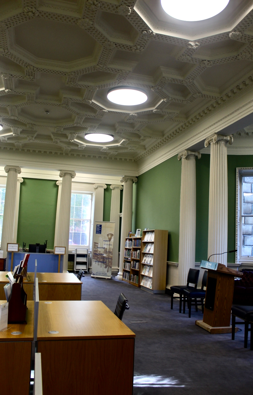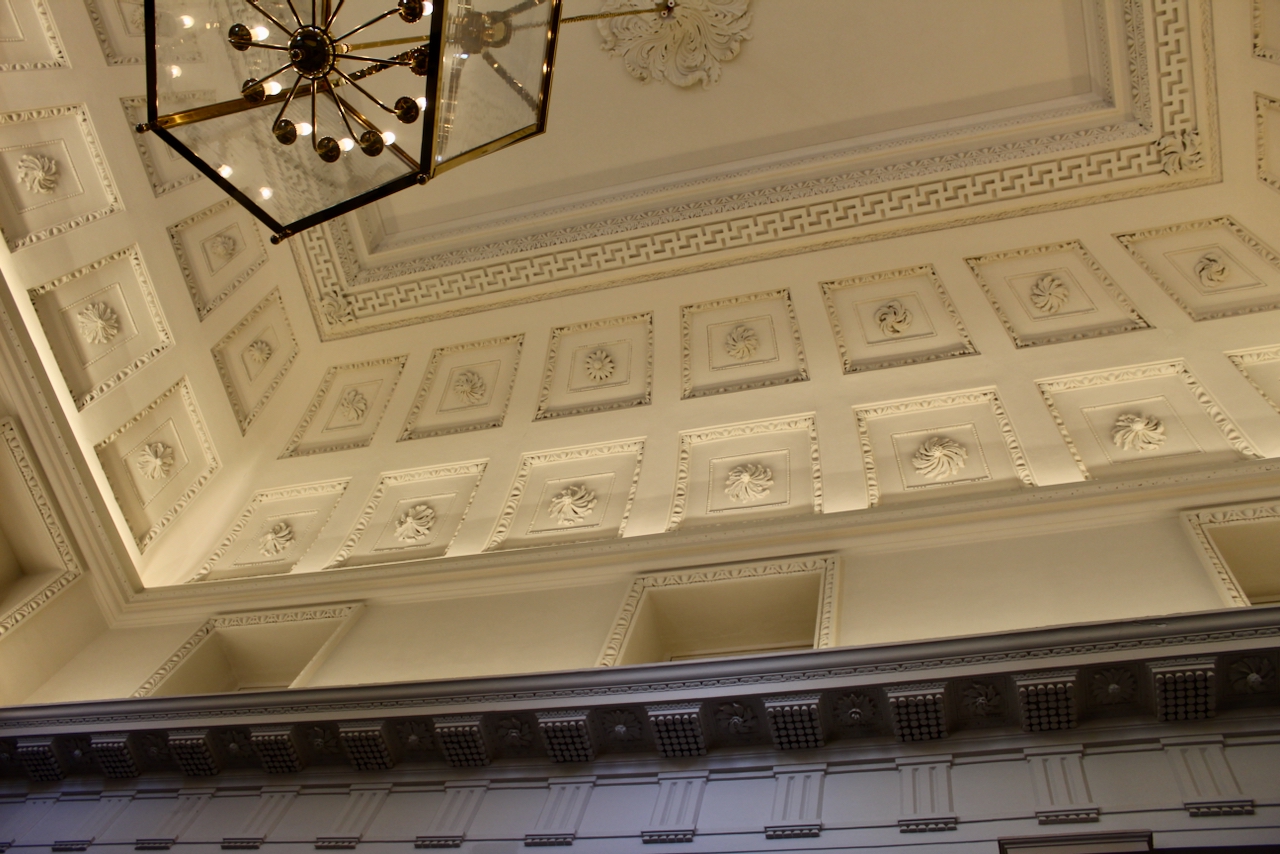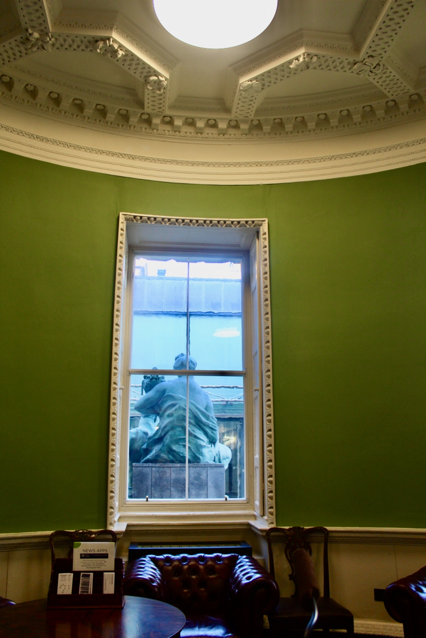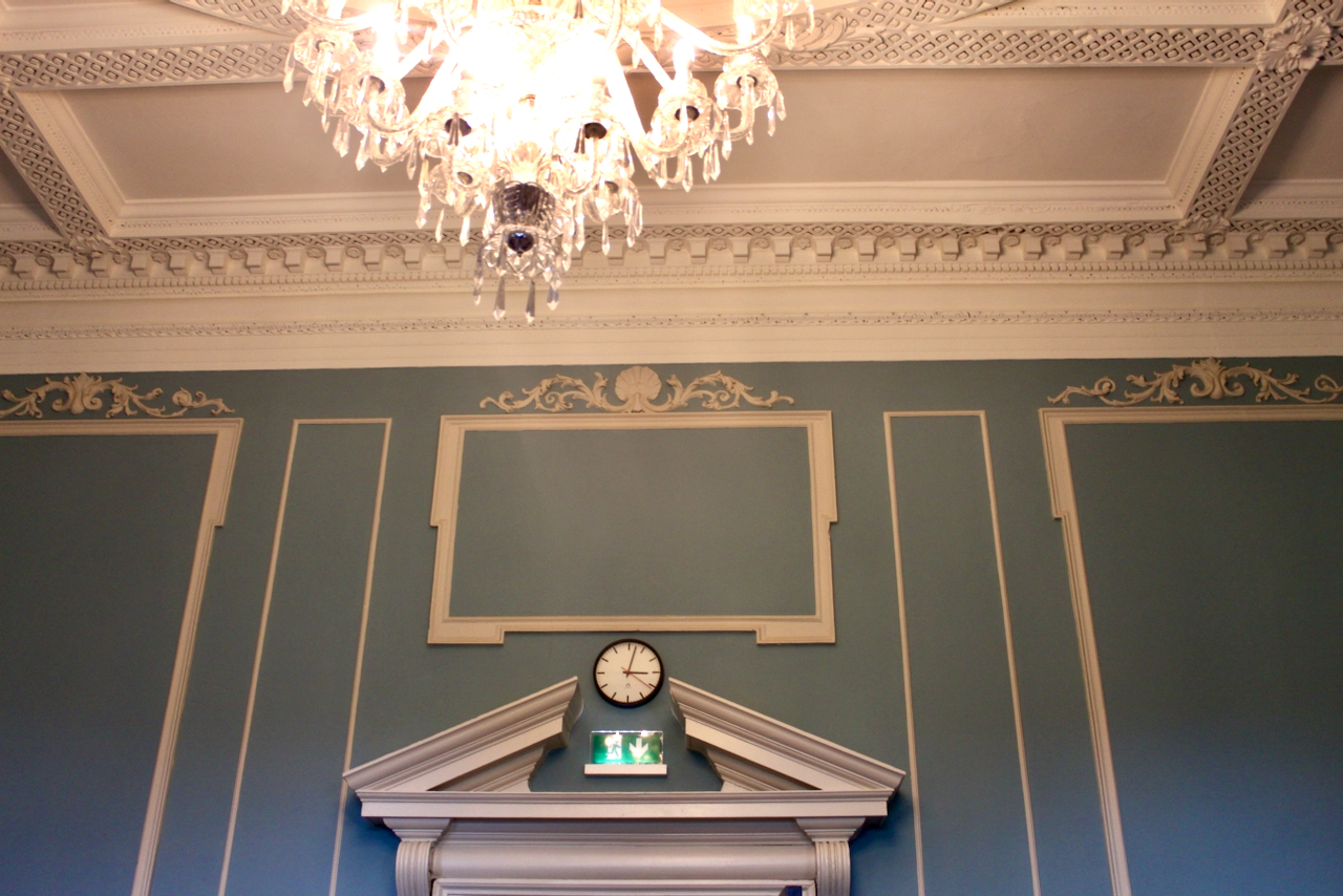 Beyond the stair hall is the former Supper Room, which is now the Library of the Oireachtais, which fills the entire depth of the house. I found the lights rather offputting and think they ruin the intended effect of the room and the ceiling, which Casey tells us derives from Sebastiano Serlio (1475-1554), an Italian architect who was part of an Italian team who built the Palace of Fontainbleau, and Tutte l’opere d’architettura et prospetiva (All the Works of Architecture and Perspective) is Serlio’s practical treatise on architecture.