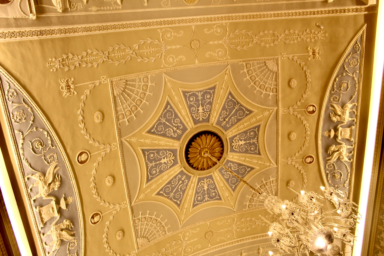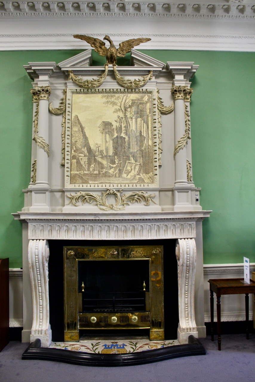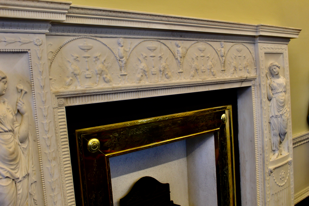 On the inner wall of the room Wyatt places three ornate double-leaf doorcases and between them two large white marble chimneypieces. The chimneypieces have high-relief female figures to the uprights and on the lintel, putti sit “between headed spandrels enclosing urns and confronted griffins.”