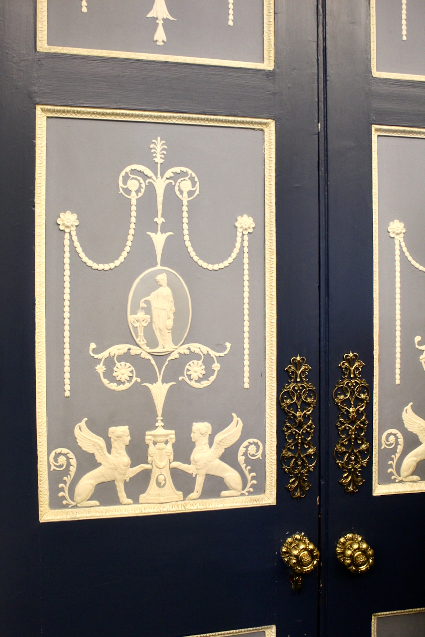 We moved from the drawing rooms to the dining room. The walls are adorned with fine medallions of Classical figures in stucco relief. They were uncovered when the walls were being redone, under layers of paint and wallpaper! The Irish Aesthete writes about them, and has beautiful photographs on his website: