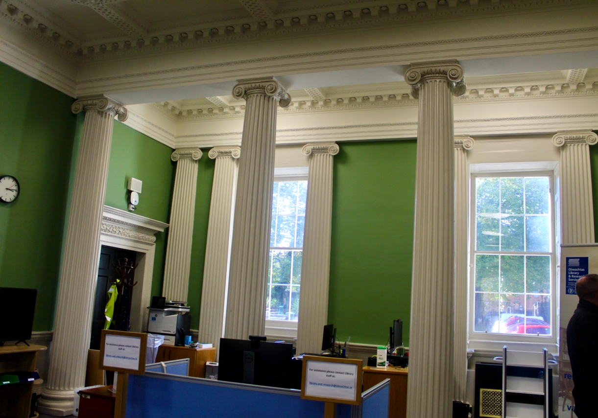 Single and paired cast iron Corinthian columns support the gallery in the former theatre. The building was appropriated as a temporary Dáil chamber in 1922 on Michael Collins’s recommendation, and in 1924 the government acquired Leinster House to be the seat of the Oireachtais. The theatre was remodelled: a new floor was inserted over the central block of seats to make a platform for the Ceann Comhairle, the clerk of the Dail, and the official reporters. The lower tier of seating was replaced with rows of mahogany and leather covered seats designed either by Hugh O’Flynn of the OPW, as the exhibition in the Irish Architectural Archive tells us, or by James Hicks & Sons according to Christine Casey, and the upper tiers became the press and public galleries. The stage was closed in and replaced by a press gallery and adjoining press rooms. The gallery was remodelled around 1930.