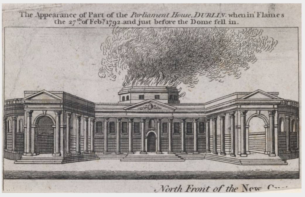 Parliament House, Dublin, with the House of Commons dome on fire, 27th February 1792.Parliament Buildings Bank of Ireland, College Green, Dublin, between ca. 1865-1914, photograph by Robert French, Lawrence Photograph Collection, National Library of Ireland.House of Lords, Parliament Building, Bank of Ireland, Dublin, between ca. 1865-1914, photograph by Robert French, Lawrence Photograph Collection, National Library of Ireland.