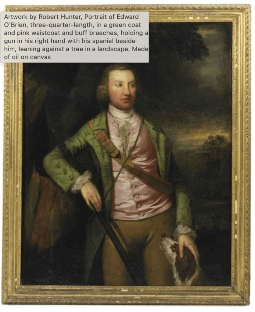 Máire Rua O’Brien née McMahon (1615/1616 – 1686) daughter of Turlough Roe McMahon Baronet, wearing Felemish bobbin lace with O’Brien coat of arms.She married first Colonel Neylan, then in 1639, Colonel Conor O’Brien (1617-1651) of Lemeneagh, ancestor of Barons Inchiquin, but he was slain in battle in 1651. She then married, to keep the family property, Captain John Cooper of Ireton’s army, whom she is said to have murdered! It’s a rare example of a portrait almost certainly painted in Ireland in the first half of the seventeenth century – see Irish Portraits 1660-1860 by Anne Crookshank and the Knight of Glin, published by the Paul Mellon Foundation for British Art 1969.Donough O’Brien (1642-1717), 1st Baronet of Lemeneagh and Dromoland, Co. Clare by Mary Beale, 1690. He lived in Dromoland Castle.He was the son of Máire Rua O’Brien née McMahon (1615/1616 – 1686) and Conor McDonogh O’Brien (1617-1651).Lucia Hamilton, 1674, daughter of George Hamilton. Wife of Donough O’Brien, 1st Baronet, married in 1674. She died two years later, not long after the birth of his son and heir, Lucius.Lucius O’Brien (1675-1717) son of Donough O’Brien 1st Baronet of Leameneh, History of the O’Briens from Brian Boroimhe, AD. 1000 to AD. 1945, by Donough O’Brien, p 212.jpgCatherine Keightley, daughter of Thomas Keightley and Frances Hyde, aunt of Queens Anne and Mary, wife of Lucius O’Brien, History of the O’Briens from Brian Boroimhe, AD. 1000 to AD. 1945, by Donough O’Brien, p 232.Edward O’Brien (1705-1765) 2nd Baronet of Dromoland, County Clare from Historical memoir of the O’Briens : The Origin and History of the O’Brien Clan, by John O’Donoghue A.M, Barrister-at-Law, First Published in 1860 (Martin Breen 2002) Illustrations section (Collection of O’Brien of Dromoland), Public Domain, https://commons.wikimedia.org/w/index.php?curid=109837449He was the son of Lucius O’Brien.Mary Hickman, wife of Edward O’Brien, 2nd Baronet, from Historical memoir of the O’Briens : The Origin and History of the O’Brien Clan, by John O’Donoghue A.M, Barrister-at-Law, First Published in 1860 (Martin Breen 2002) Illustrations section, Public Domain,https://commons.wikimedia.org/w/index.php?curid=109837783Lucius O’Brien (1731-1795) 3rd Baronet, courtesy of Harnet – The Other Clare Vol. 9 page 14,15.Ann Ffrench wife of Sir Lucius O’Brien, 3rd Baronet courtesy Unknown author – These My Friends and Forebears: The O’Briens of Dromoland. She was daughter of Robert Ffrench of Monivea Castle, County Galway, MP for County Galway, and of Nichola Acheson, daughter of Arthur, 5th Baronet of Market Hill, County Armagh.Capt. Edward O’Brien, holding a musket in the uniform of 52nd Regiment of Foot, standing against landscape, line of infantry firing a volley against an advisory, by Robert Hunter (1715 – 1780), courtesy of Adam’s auction 16 Oct 2018. Edward O’Brien (c. 1735-1787) was the third son of Sir Edward O’Brien 2nd Baronet of Dromoland and Mary Hickman. A portrait of him and titled Master Edward O’Brien by Philip Hussey was exhibited with the Irish Portraits 1660 1860 Dublin, London and Belfast 1970, Cat no. 31. His ambition was to be a solider but there was no money to buy a Cornecy of Dragoons until 1759. A riding accident prevented his joining Corps being raised to go to America. He became a Captain in the 122nd Regiment and then exchanged (costing £379 3 4) into the 52nd Regiment. He married his cousin Charlotte Hickman of Brickhall, Co. Clare. With his easy-going spendthrift nature and love of horses, it is easy to see why he was his fathers favourite son. Although his father had left him Jockey Hall on the Curragh, he was not able to provide for his family and appealed to his more serious brother, Lucius, for help who assigned him a life interest in lands at Leamanagh and organised his return to military service. However, he forbade him from leaving the kingdom, thereby again preventing him going to America where he thought he could distinguish himself. He died in 1787 with the rank of colonel.Edward O’Brien, 1766, attributed to Robert Hunter, auctioned Christie’s, July 2011. It could be Colonel Edward O’Brien (1737-1787) of Dromoland Castle and of Millicent House County Kildare.