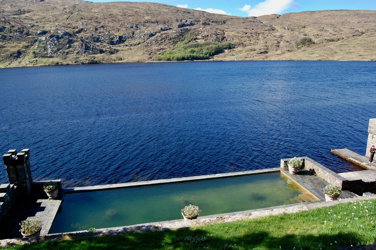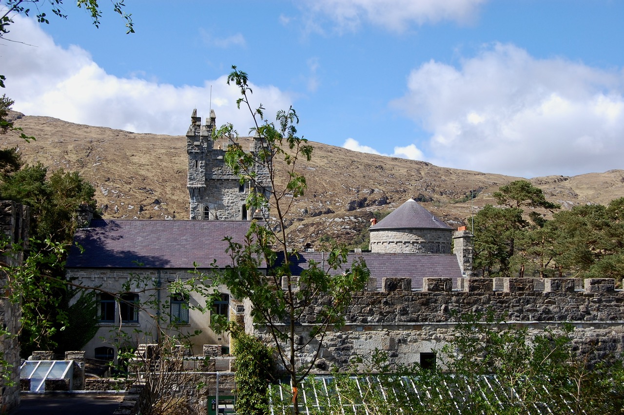 p. 139. “(Adair/LG1863) A Victorian Baronial castle of rough-hewn granite at the end of a wooded promontory jutting out into Lough Veagh, surrounded by the bare and desolate hills of a deer-forest, so large as to seem like a world apart. Built 1870 [the website tells us 1857-9] by J.G. [John George] Adair, of Bellegrove, Co Leix, whose wife was a rich American heiress [Cornelia Wadsworth]; designed by his cousin, J.T. Trench. The castle consists of a frowning keep with Irish battlements, flanked by a lower round tower and other buildings; the effect being one of feudal strength. The entrance is by way of a walled courtyard. Glenveagh has always had an American connection; after the death of Mrs Adair, it was bought by the distinguished American archaeologist, Prof Kingsley Porter; then, in 1938, it was bought by its late owner, Mr Henry McIlhenny, of Philadelphia. Mr McIlhenny, whose hospitality was legendary, decorated and furnished the interior of the castle in a way that combined the best of the Victorian age with Georgian elegance and modern luxury; and which contrasted splendidly with the rugged medievalism of the exterior and the wildness of the surrounding glen. He also made what is now one of the great gardens of the British Isles. There are terraces with busts and statues, there is a formal pool by the side of the lough, an Italian garden, a walled garden containing a Gothic orangery designed by M. Philippe Jullian; while the hillside above the castle is planted with a wonderful variety of rare and exotic trees and shrubs.” [1]