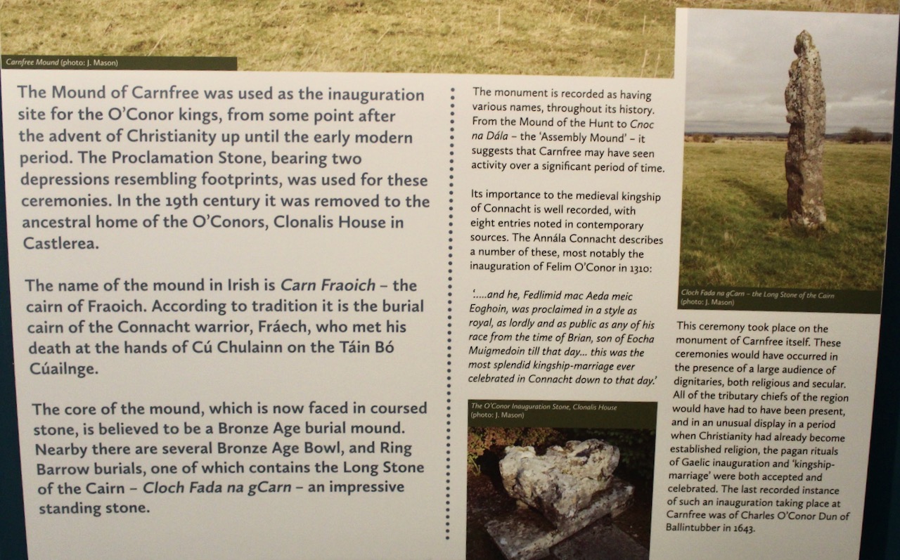 The Clonalis website describes the ceremony of inauguration of a king. He symbolically married the soil over which he was to rule, and the sacred stone acted as the King’s bride in the ceremony known as “Banais Ri” (the King’s Marriage”). This stone was probably used to inaugurate thirty O’Conor kings!