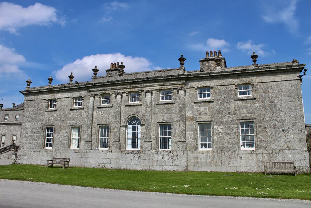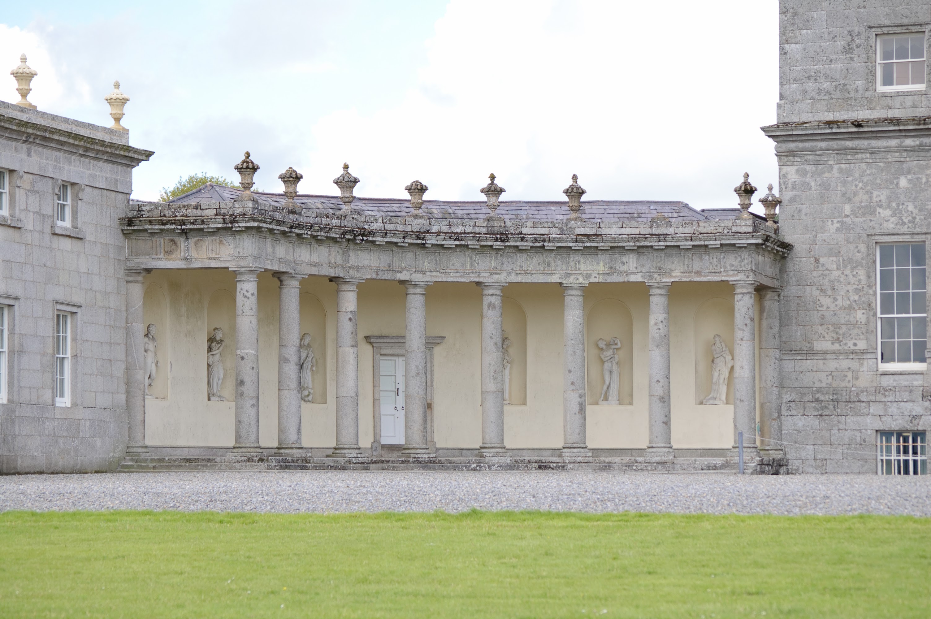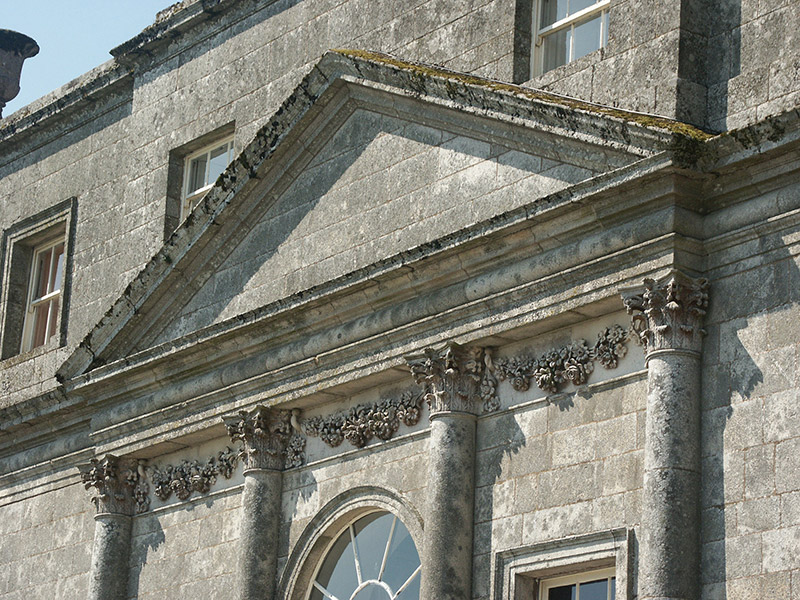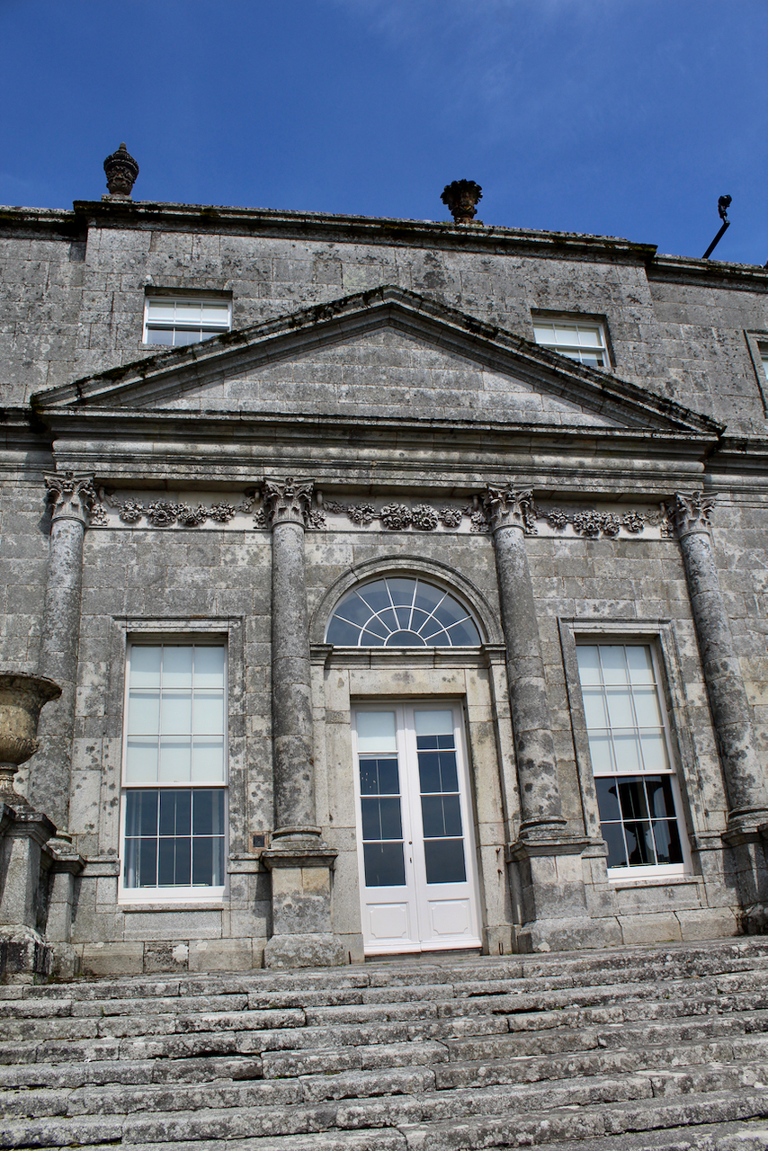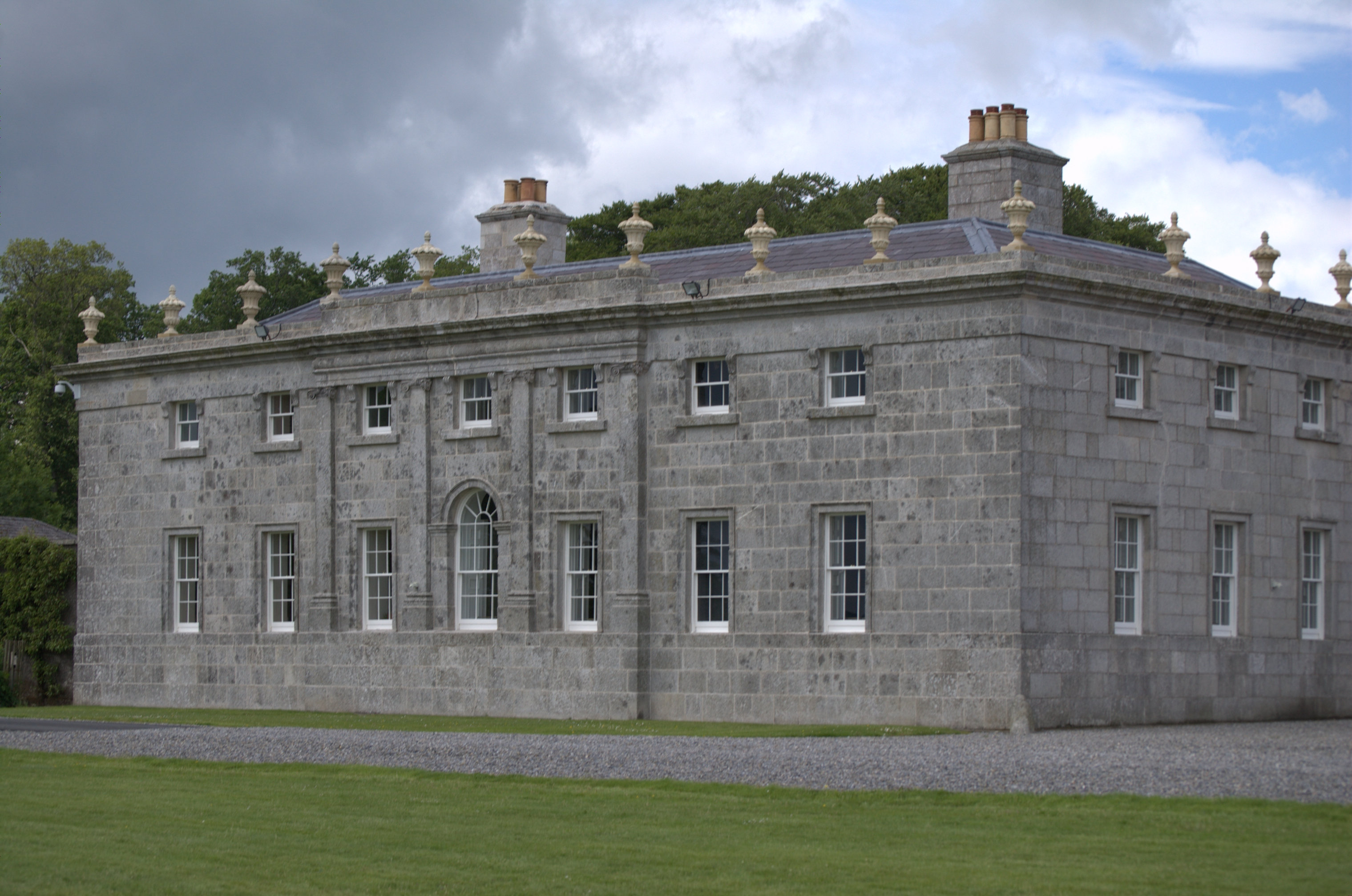 The residential part of the house is quite small, and is entirely housed in the central block. Of seven bays across, it houses three rooms along its front. It is made of local granite from Golden Hill quarry rather than the more expensive Portland stone often imported from Britain. In Sean O’Reilly’s discussion of the house in his Irish Houses and Gardens (from Country Life), he explains the styles used on the facade of the house: