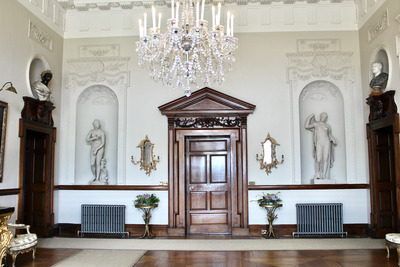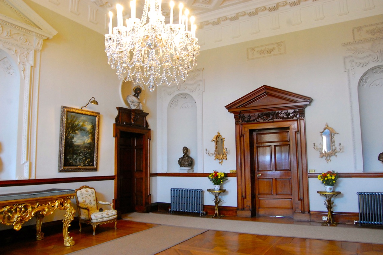 The principal reception rooms lead from one to the other around the central block: the saloon, drawing-room, dining-room, tapestry room and the grand staircase. They retain their original doorcases with carved architraves of West Indian mahogany, marble chimneypieces and floors of inlaid parquetry.