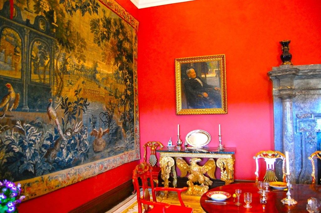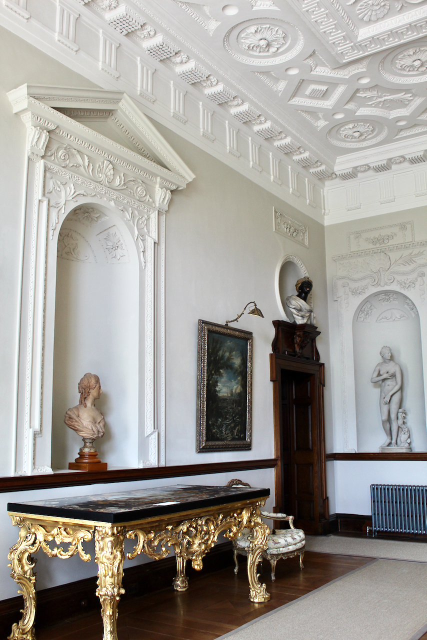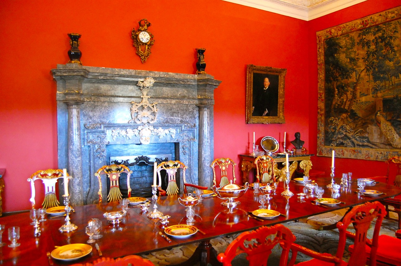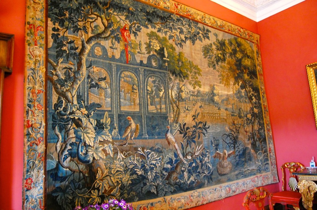“Beyond lies the boudoir, a charming little panelled apartment with a Bossi chimney-piece dating around 1780. From here visitors pass into the tapestry-hung corridor leading to the pavilion, formerly the bachelor’s quarters. The dining-room, formerly the library, on the opposite side of the hall has a monumental Irish chimney-piece of mottled grey Sicilian marble. The walls are ornamented both by paintings from the Beit collection and two magnificent Louis XIV tapestries.” [11]