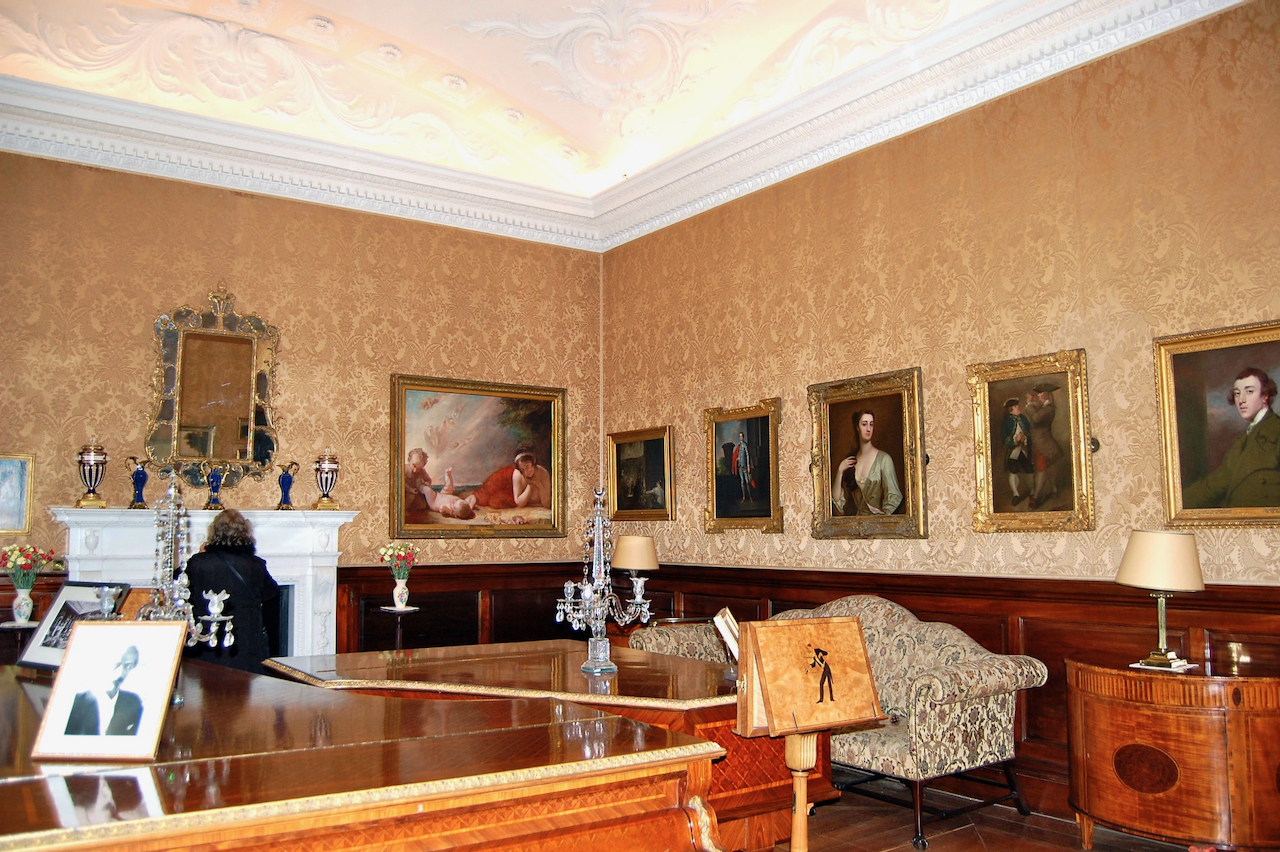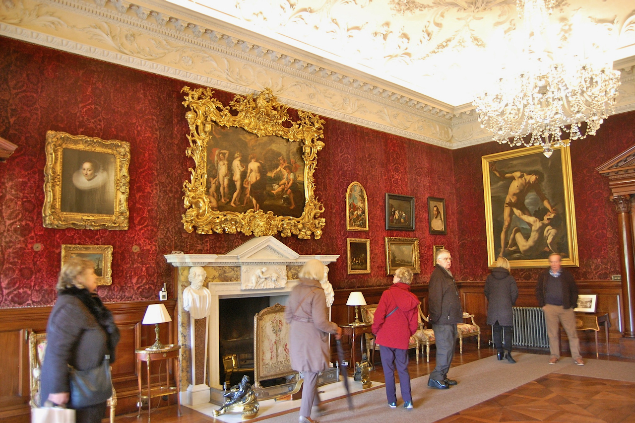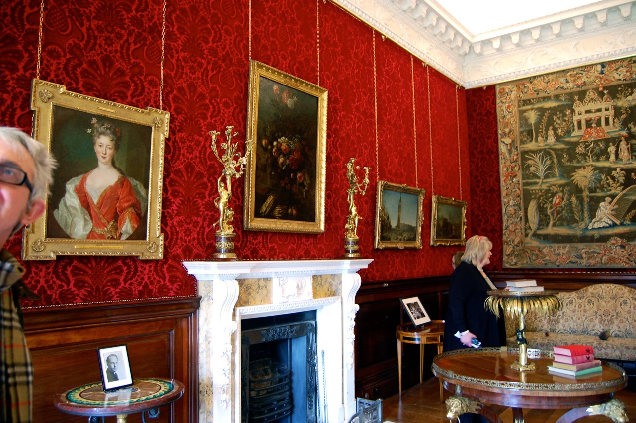 “The walls are covered with a crimson cut Genoese velvet dating from around 1840 – an ideal background for paintings which include many pictures from the Beit collection. The room also has Louis XVI furniture in Gobelins tapestry signed by Pluvinet, a pair of Japanese lacquer cabinets from Harewood House and a chimney-piece identical to one at Uppark in Sussex, which must be the work of Thomas Carter (the younger) of London.