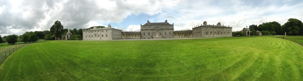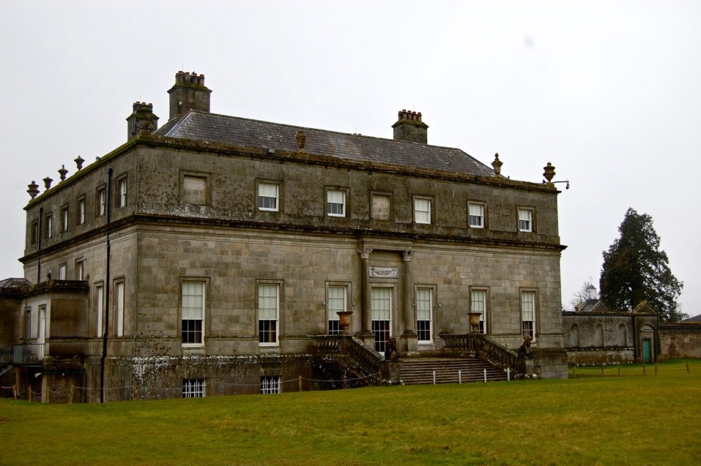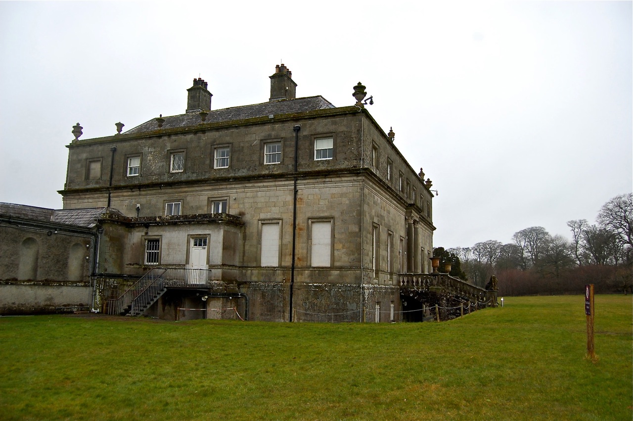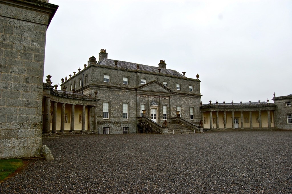Photo taken by Jeremy Hylton, showing the extent of the centre block with the curving Doric colonnades and two-storey seven bay wings. Beyond the wings on either side of the central block, one can see the arches with cupolas. The full stretch contains kitchen and stable wings.