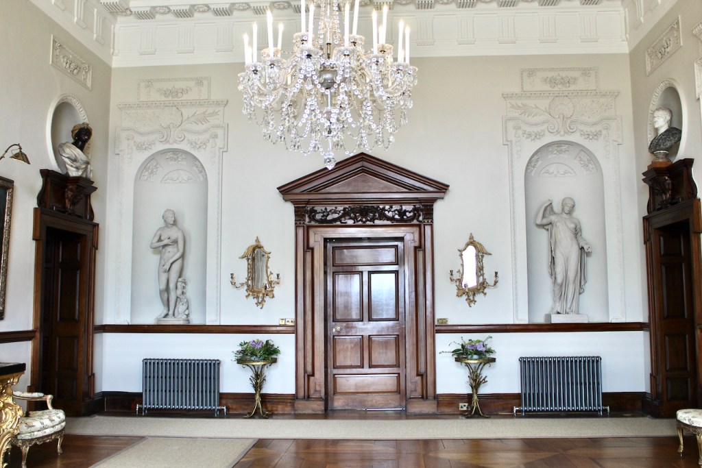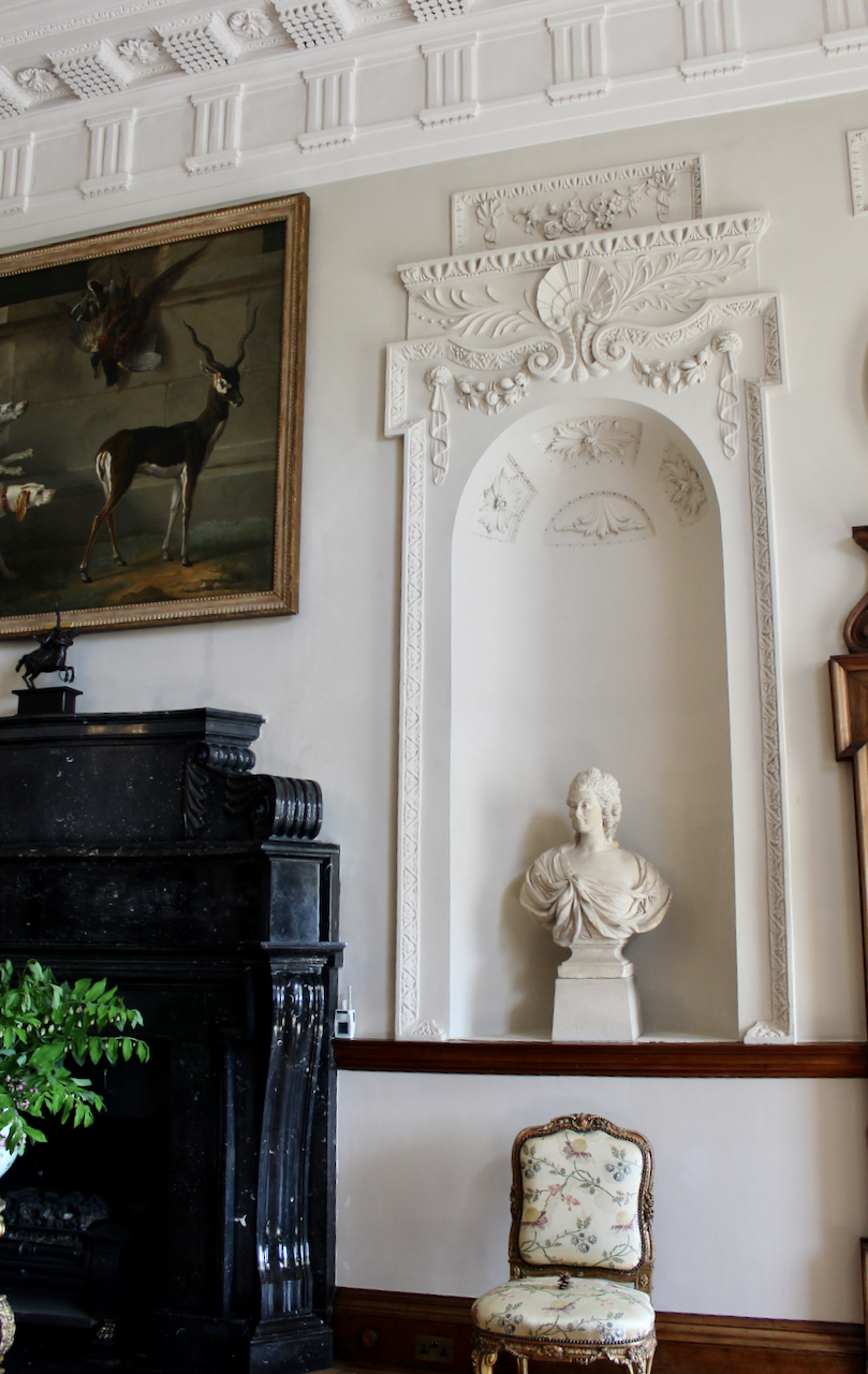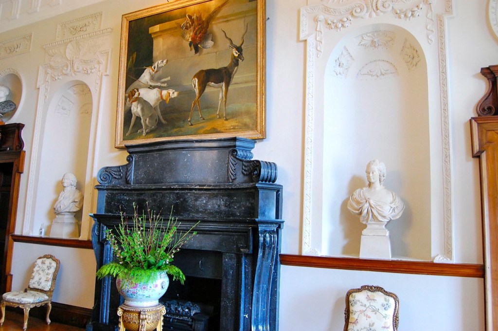 “Ascending the broad flight of granite steps guarded by a pair of carved lions, the visitor enters the front hall – a well-proportioned room with a floor of polished oak and an ornate but severe compartmental ceiling with Doric frieze quite similar to the one Castle deigned for Leinster House. The monumental chimneypiece is of black Kilkenny marble, much favoured by Castle for entrance halls, while above it hangs a striking painting by Oudry of Indian Blackbuck with Pointers and Still Life, dated 1745.” [11]