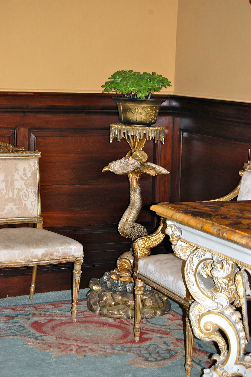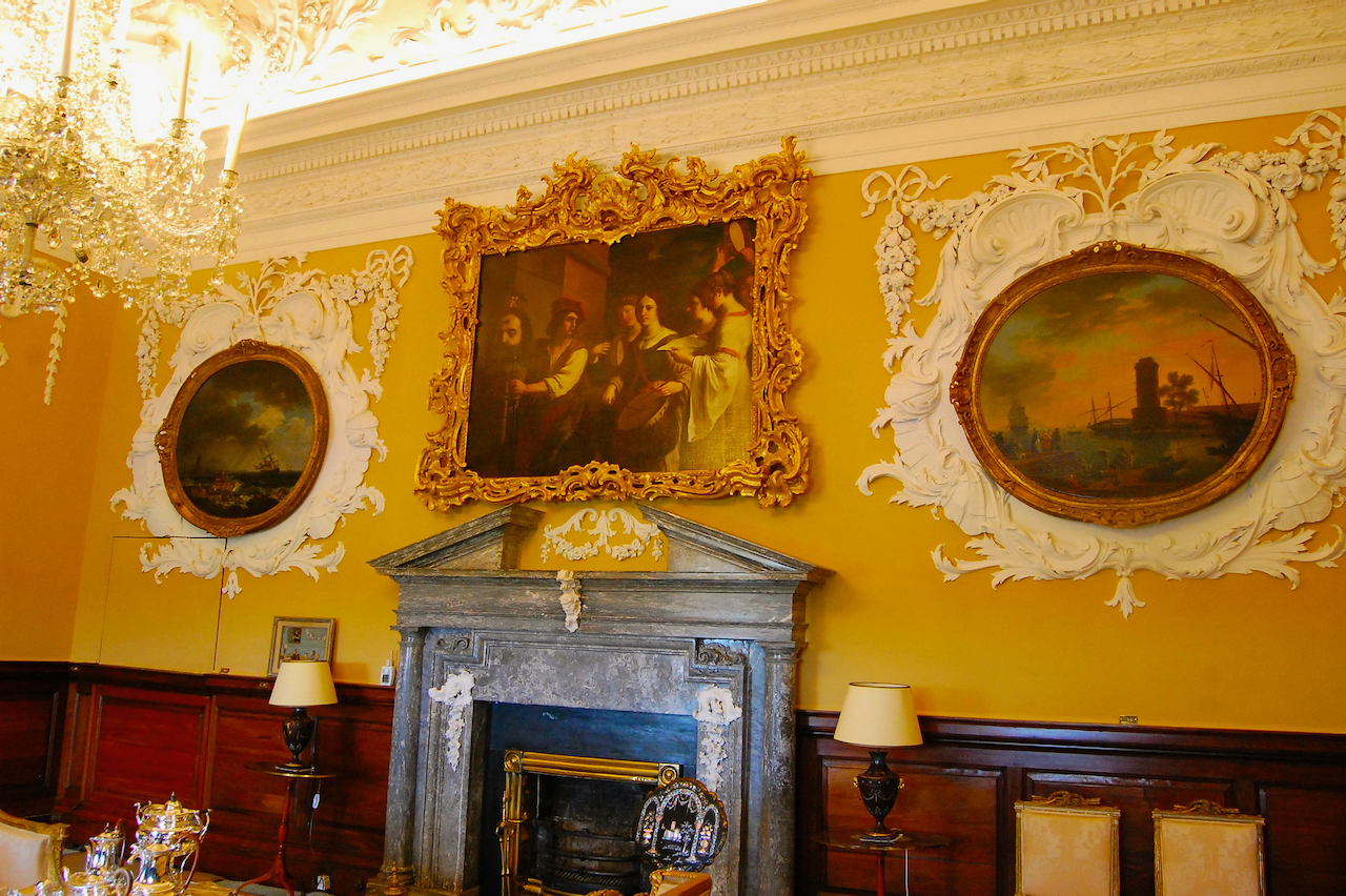 “Infused with a restless energy the plasterwork of the adjacent drawing-room spills onto the walls, where fantastic plaster frames surround the four oval marine scenes by Vernet representing morning, noon, evening and night. Although part of the patrimony of the house, these pictures were sold in 1926 and only after a determined search were recovered 43 years later by Sir Alfred Beit. [12]