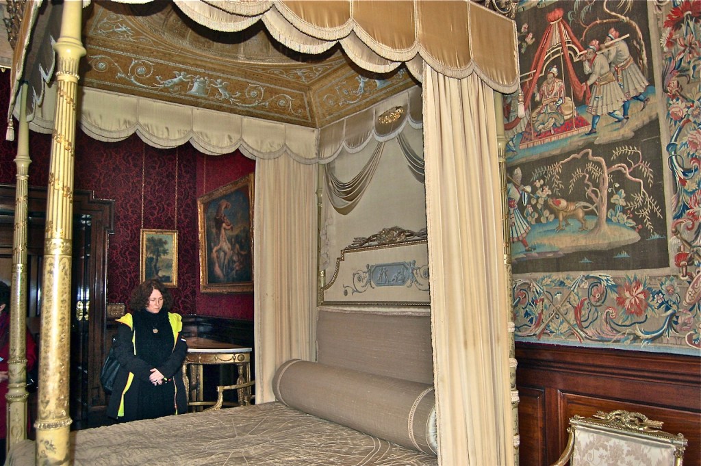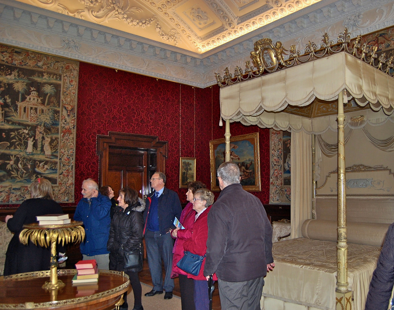 “The coffered and richly decorated barrel-vaulted ceiling of the tapestry room, to the south of the music room, is by a less experienced artist, though the room is no less impressive than the others and contains an English state bed made in London in 1795 and two Soho tapestries of Moghul subjects by Vanderbank.“